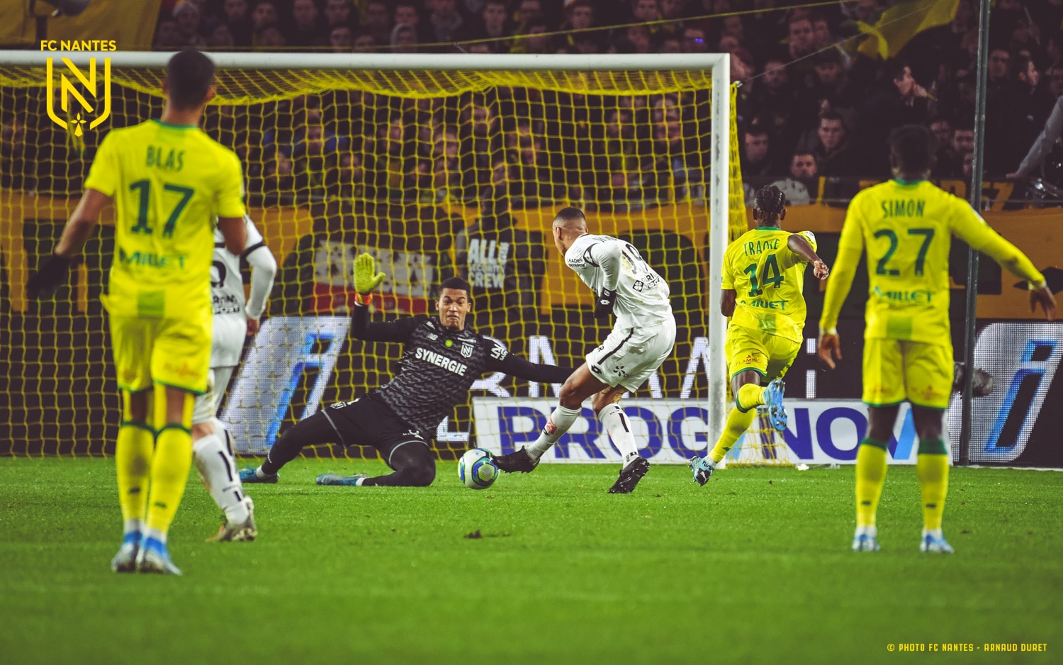 Maillot FC Nantes porté par Alban Lafont lors du match comptant pour la 17ème journée de Ligue 1 le 8 Décembre 2019 contre Dijon. Maillot unique avec un patch « nounours » sur l’avant du maillot pour ce match précédé d’un lancer de peluches pour accompagner le Secours Populaire.
