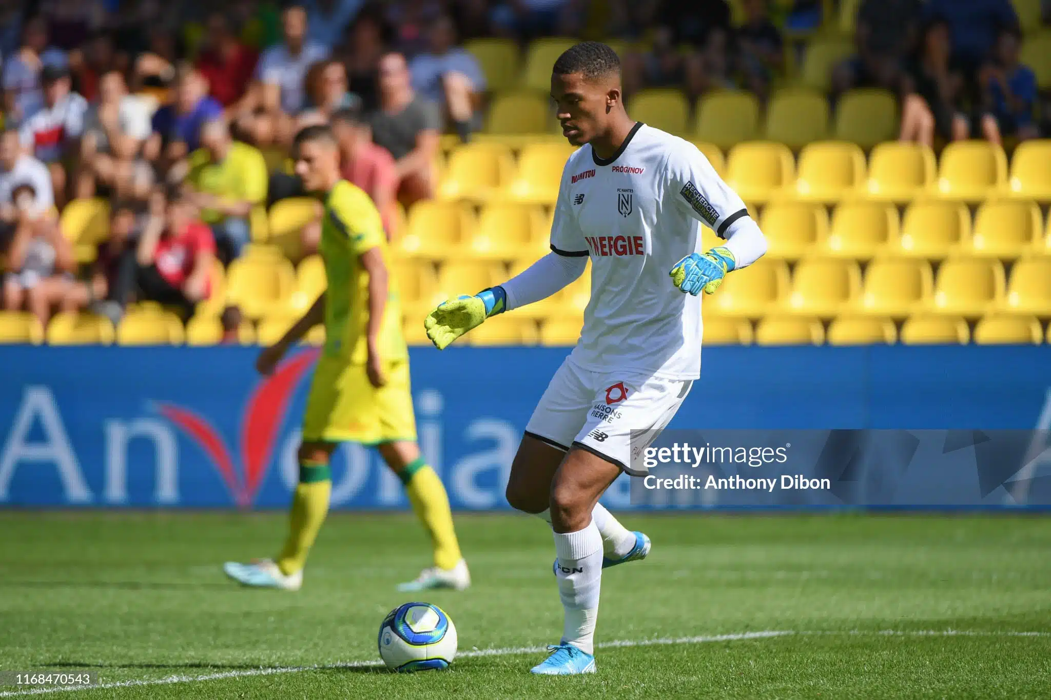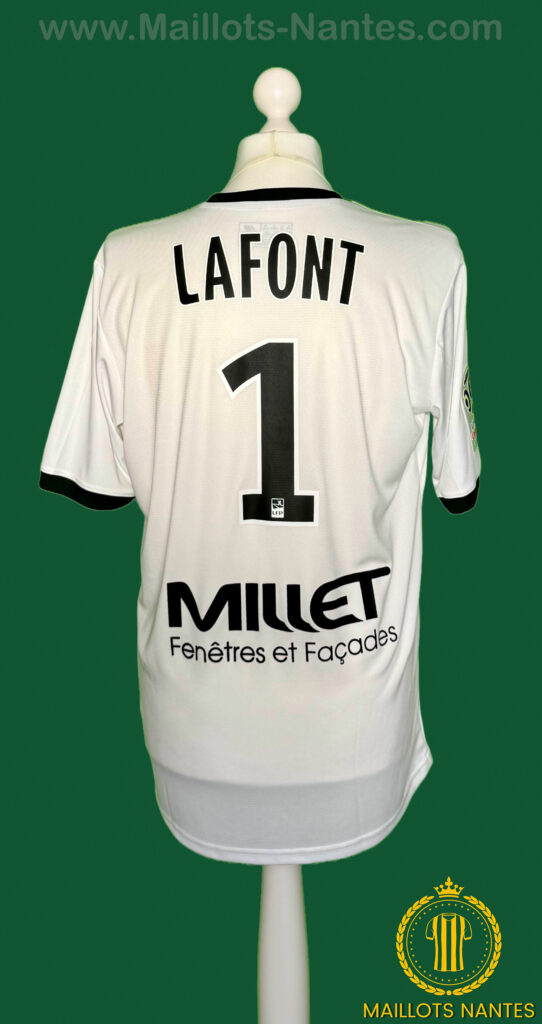 Maillot FC Nantes porté par Alban Lafont lors du match comptant pour la 5ème journée de Ligue 1 le 15 Septembre 2019 contre Reims. Pour ce match, le sponsor LNA Santé, habituellement présent sur la manche gauche du maillot des joueurs nantais cède sa place au logo de la Fondation pour la Recherche sur Alzheimer.