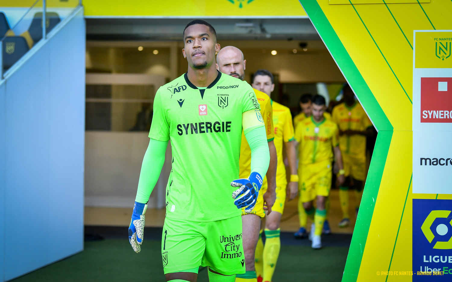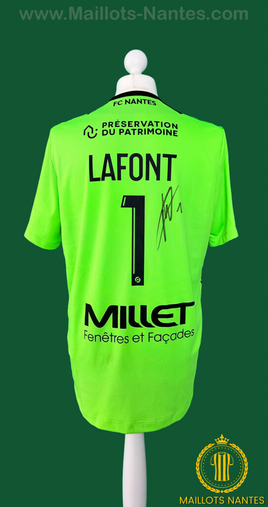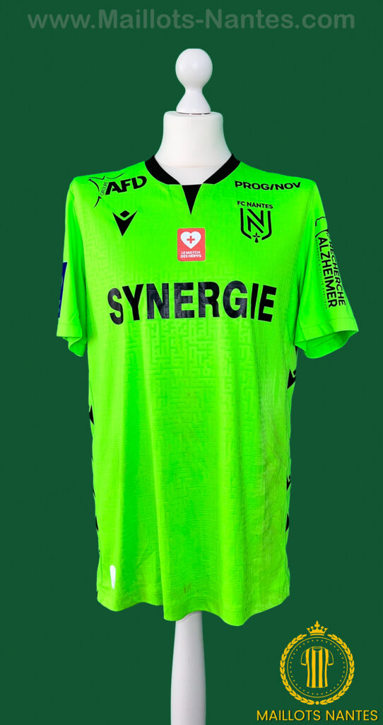 Maillot FC Nantes porté par Alban Lafont lors du match comptant pour la 7ème journée de Ligue 1 le 22 Septembre 2021 face à Brest. Pour ce match, le sponsor LNA Santé, habituellement présent sur la manche gauche du maillot des joueurs nantais cède sa place au logo de la Fondation pour la Recherche sur Alzheimer.
