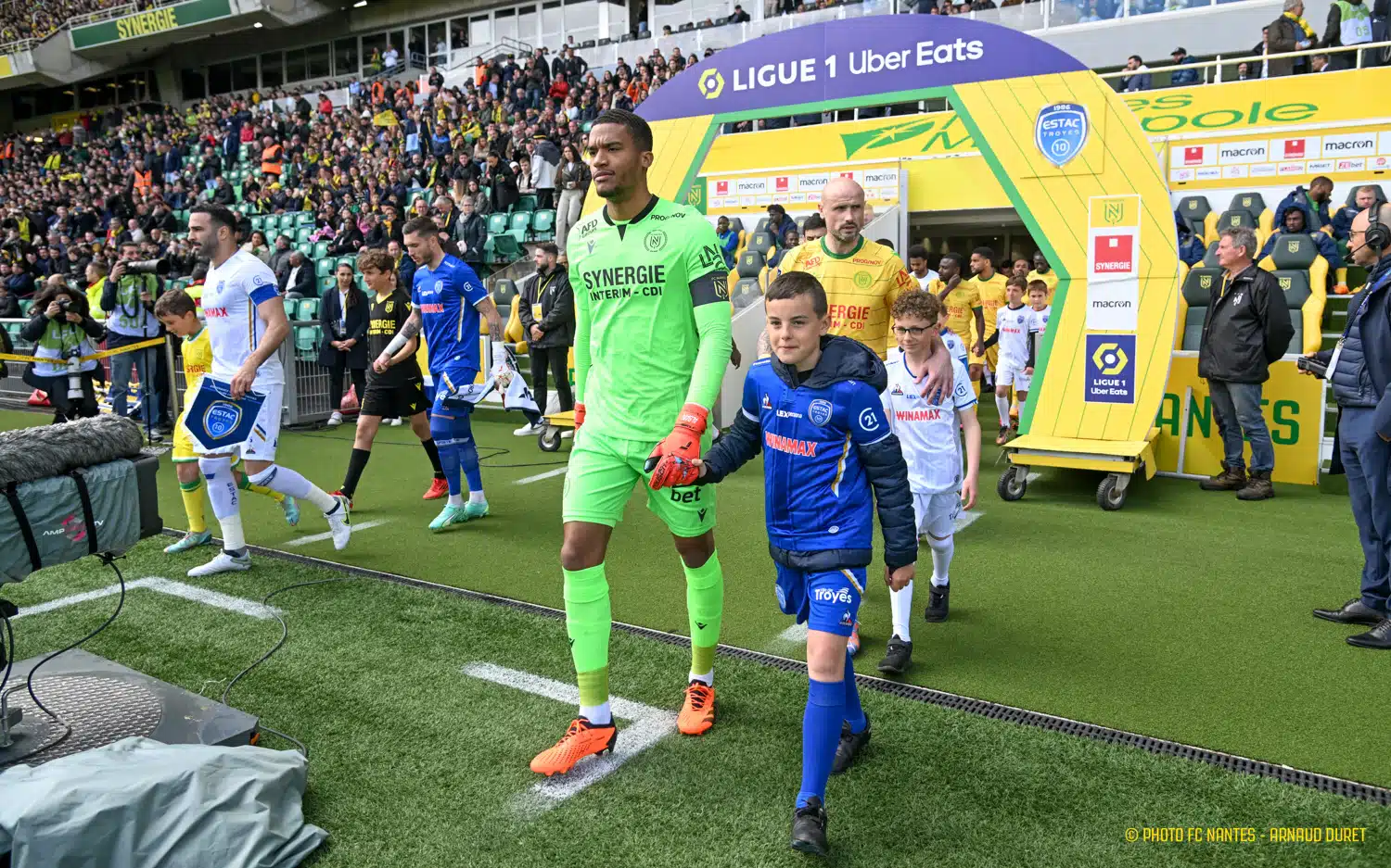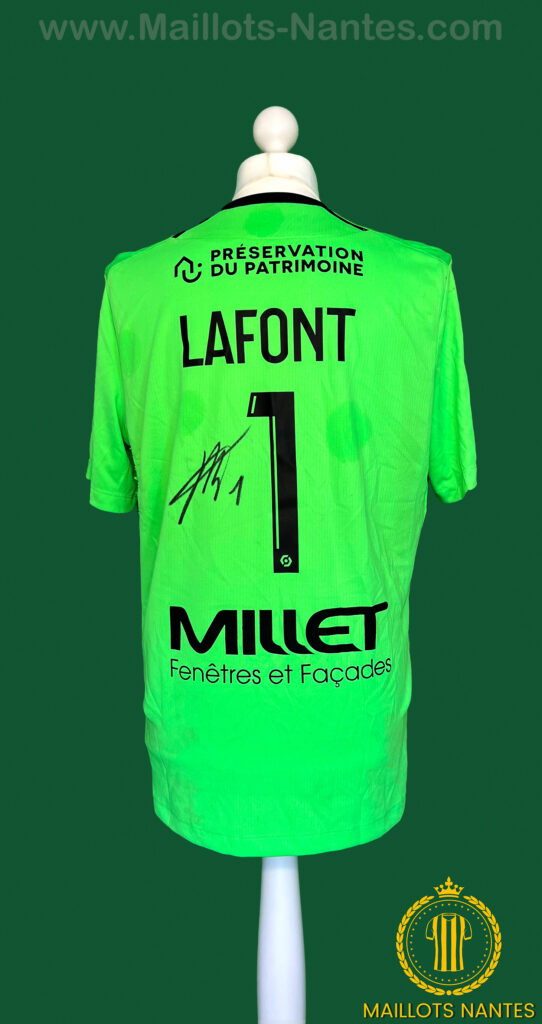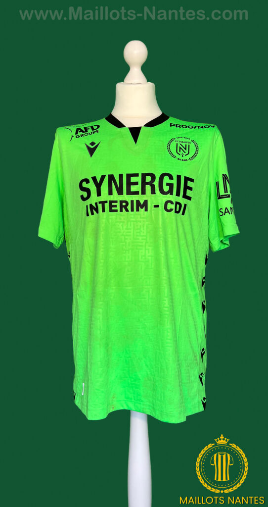 Maillot FC Nantes porté par Alban Lafont lors du match de la 32ème journée de Ligue 1 le 23 Avril 2023 contre Troyes. Il s’agit du maillot gardien de la saison précédente sur lequel des lauriers ainsi que les inscriptions 1943 – 2023 et 80 ans ont été ajoutés afin de fêter le 80ème anniversaire du club.