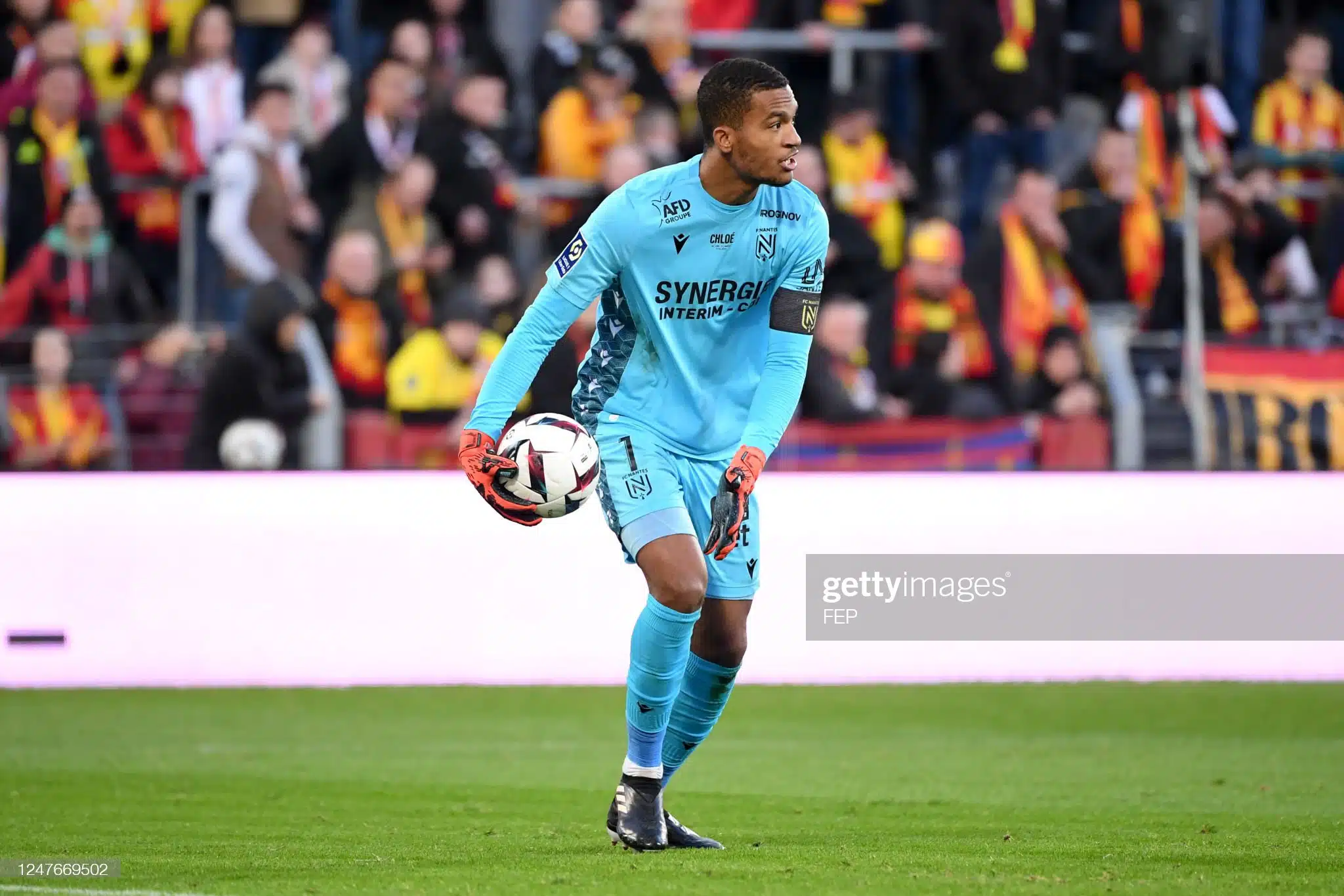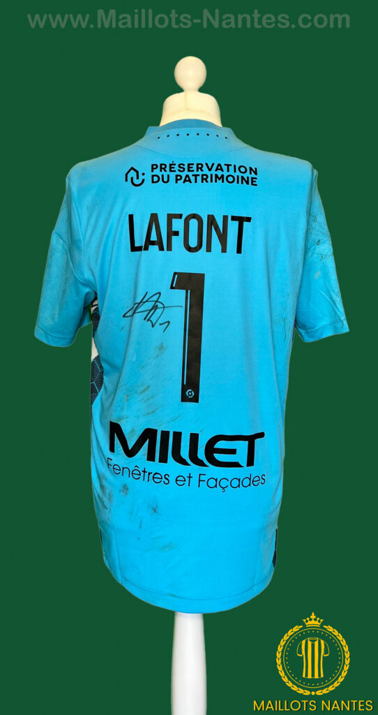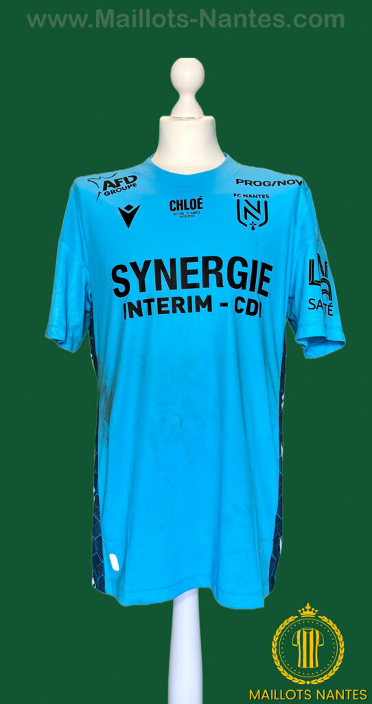 Maillot FC Nantes porté par Alban Lafont lors du match de la 24ème journée de Ligue 1 le 19 Février 2023 à Lens. Maillot arborant le prénom Chloé en hommage à Chloé Ganago, fille d’Ignatius Ganago décédée tragiquement à l’âge de 5 ans emportée par une maladie.