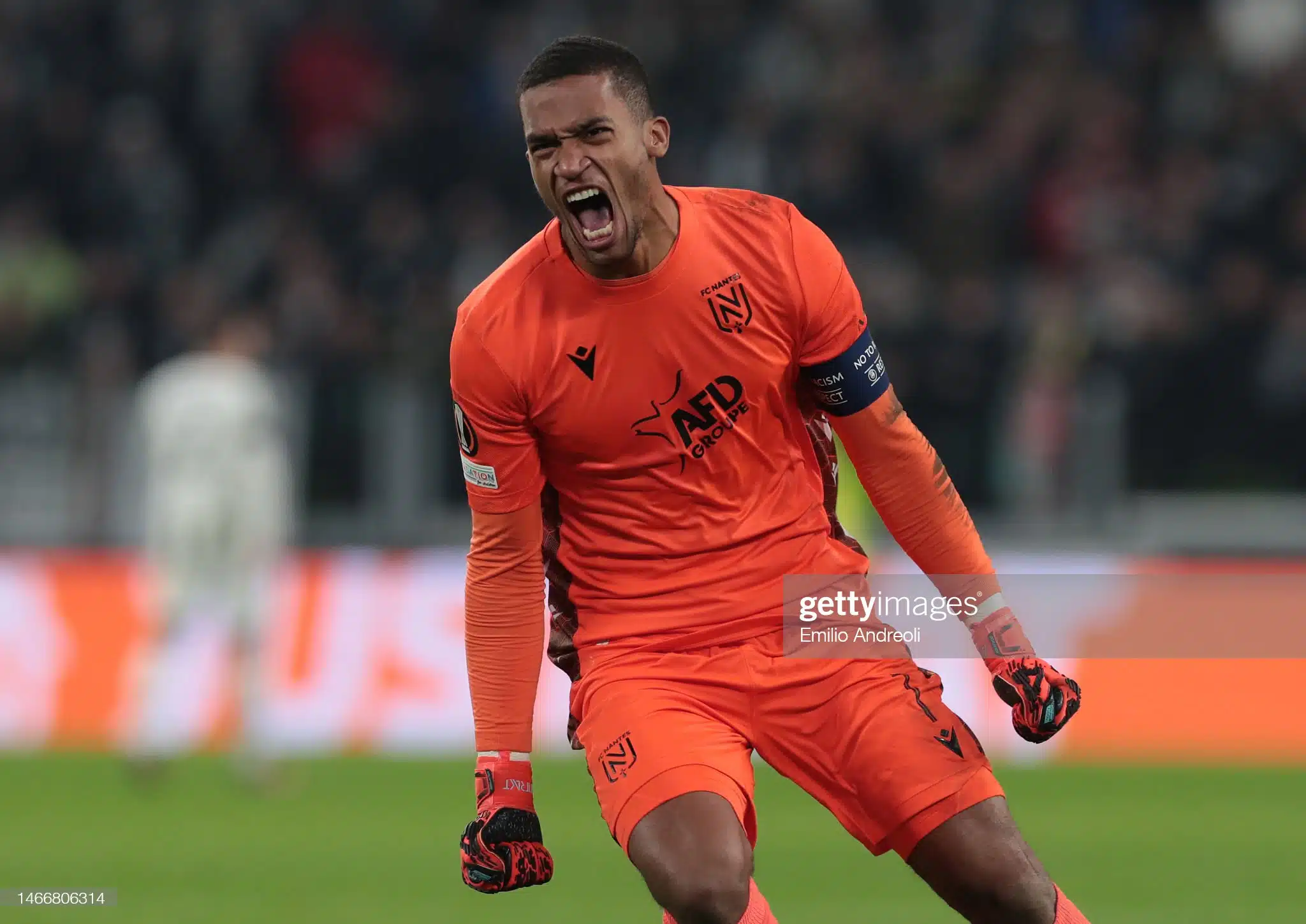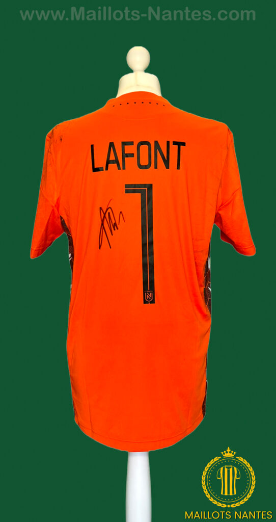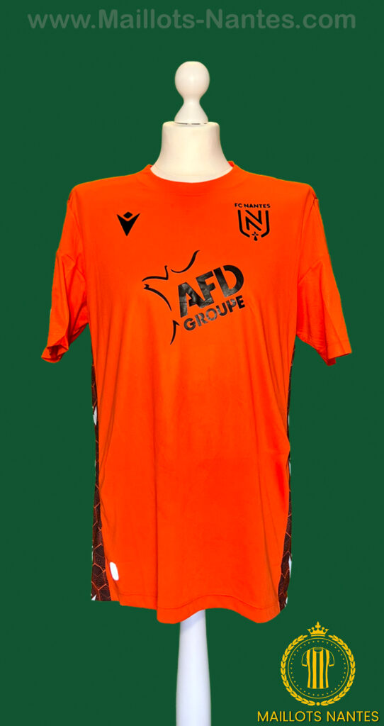 Maillot FC Nantes porté par Alban Lafont lors du match comptant pour le barrage aller de la phase à élimination directe d’Europa League le 16 Février 2023 à Turin contre la Juventus. Ce modèle orange n’a été utilisé qu’a deux reprises, à Baku contre Qarabag et à Turin.