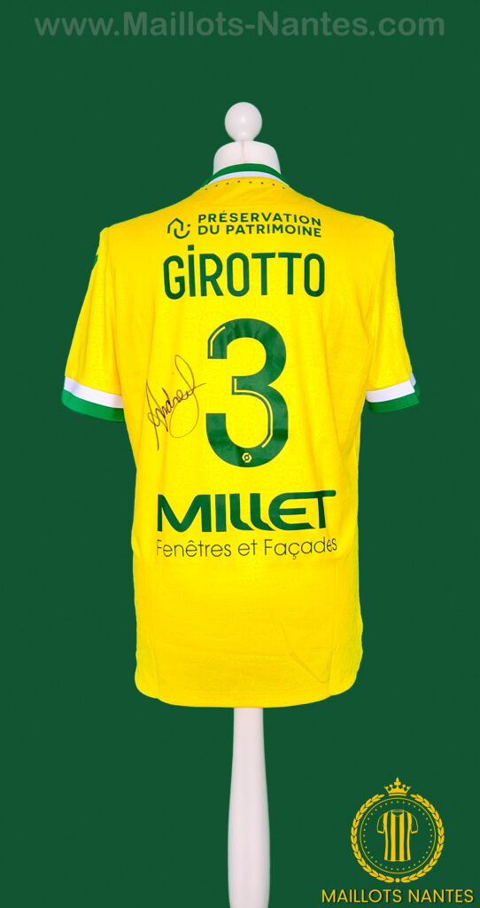 Maillot FC Nantes porté par Andrei Girotto lors du match de la 8ème journée de Ligue 1 le 18 Septembre 2022 contre le RC Lens. Pour ce match, le sponsor LNA Santé, habituellement présent sur la manche gauche du maillot des joueurs nantais cède sa place au logo de la Fondation pour la Recherche sur Alzheimer.