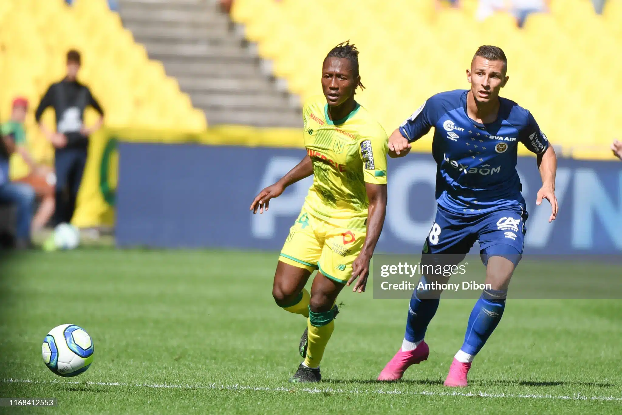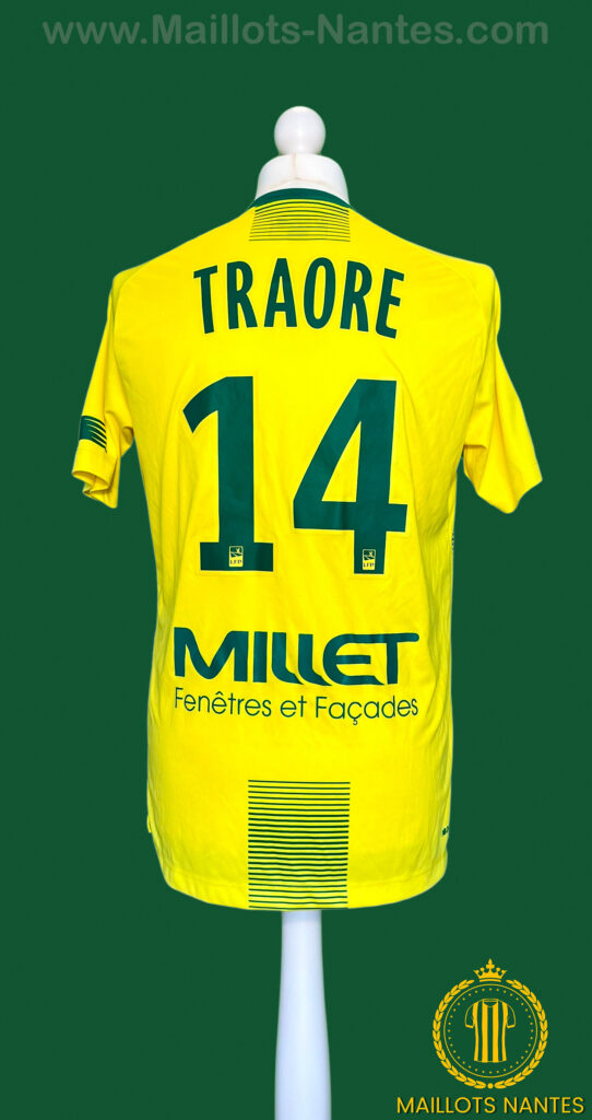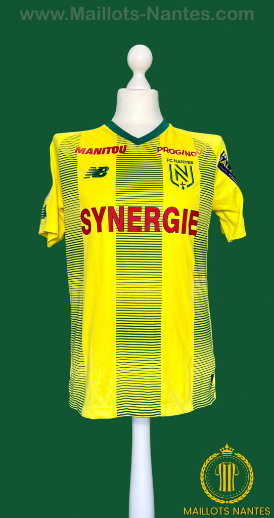 Maillot FC Nantes porté par Charles Traoré lors du match comptant pour la 5ème journée de Ligue 1 le 15 Septembre 2019 contre Reims. Pour ce match, le sponsor LNA Santé, habituellement présent sur la manche gauche du maillot des joueurs nantais cède sa place au logo de la Fondation pour la Recherche sur Alzheimer.