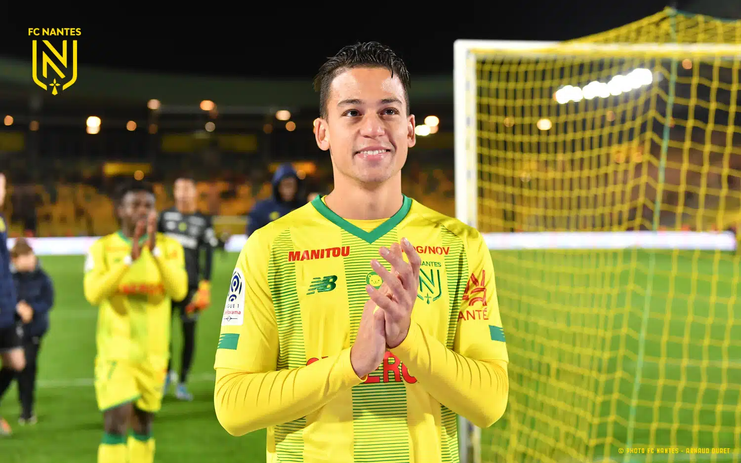 Maillot FC Nantes porté par Cristian Benavente lors du match comptant pour la 17ème journée de Ligue 1 le 8 Décembre 2019 contre Dijon. Maillot unique avec un patch « nounours » sur l’avant du maillot pour ce match précédé d’un lancer de peluches pour accompagner le Secours Populaire.