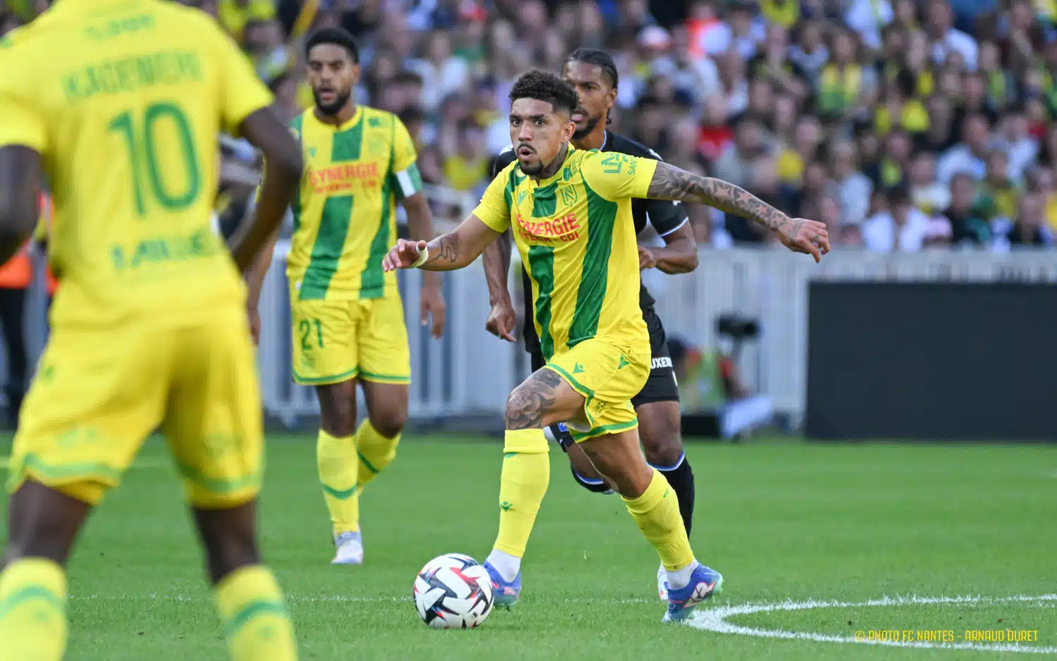 A quelques jours de la 3ème édition de la DAG, le coup d’envoi de la rencontre est donné par Loïc Amisse et Eliot Daguillon. Les joueurs arborent aussi un patch sur le maillot, en soutien à cette course caritative qui a pour but de récolter des fonds pour la lutte contre le cancer et de se souvenir de Philippe Daguillon – emblématique kiné du FC Nantes.