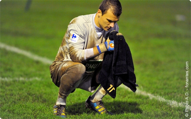 Maillot FC Nantes porté par Erwin Zelazny lors du match du 8ème tour de la Coupe de France à Rennes contre Rennes TA le 9 Décembre 2011.