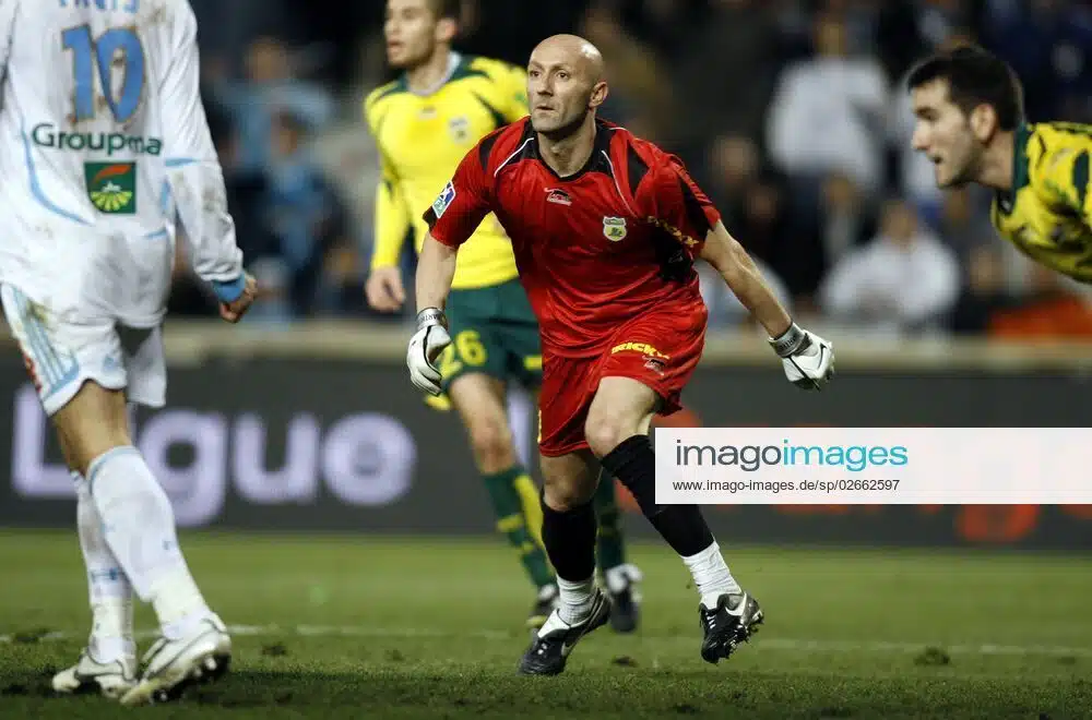 Maillot FC Nantes porté par Fabien Barthez lors du match de la 25ème journée de Ligue 1 à Marseille le 18 Février 2007. Pas de sponsor à l’avant car Gamebookers qui était prévu pour être le sponsor maillot des matchs à l’extérieur a été interdit après 5 journées de championnat.