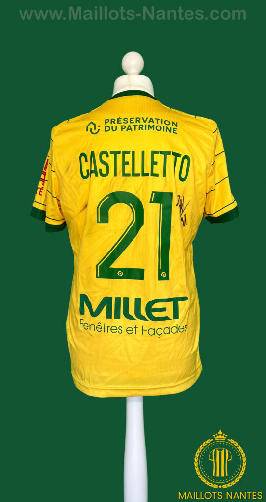 Maillot FC Nantes porté par Jean-Charles Castelletto 2022/2023 par Maillots-Nantes 3 mai 2023 3 mai 2023 835 vues 835 Maillot FC Nantes porté par Jean-Charles Castelletto lors du match de la 32ème journée de Ligue 1 le 23 Avril 2023 contre Troyes. Maillot utilisé lors de ce match afin de fêter le 80ème anniversaire du club. Saison : 2022/2023. Compétition : Ligue 1. Marque : Macron. Sponsors : Synergie, Groupe AFD, Proginov, LNA Santé, Groupe Millet, Préservation du Patrimoine. 0 commentaires 0 FacebookTwitterEmail N'hésitez pas à consulter ces autres maillots Maillot FC Nantes porté par Emiliano Sala 2017/2018 Maillot FC Nantes porté par Filip Djordjevic 2013/2014 Maillot FC Nantes porté par Jean Michel Ferri 1991/1992 Maillot FC Nantes porté par Ciprian Tatarusanu 2017/2018 Maillot FC Nantes préparé pour Franck Renou 1996/1997 Maillot FC Nantes porté par Koffi Djidji 2016/2017 Maillot FC Nantes porté par Nicolas Pallois 2019/2020 Maillot FC Nantes porté par Lucas Evangelista 2018/2019 Maillot FC Nantes porté par Alban Lafont 2019/2020 Laisser un commentaire Annuler réponse