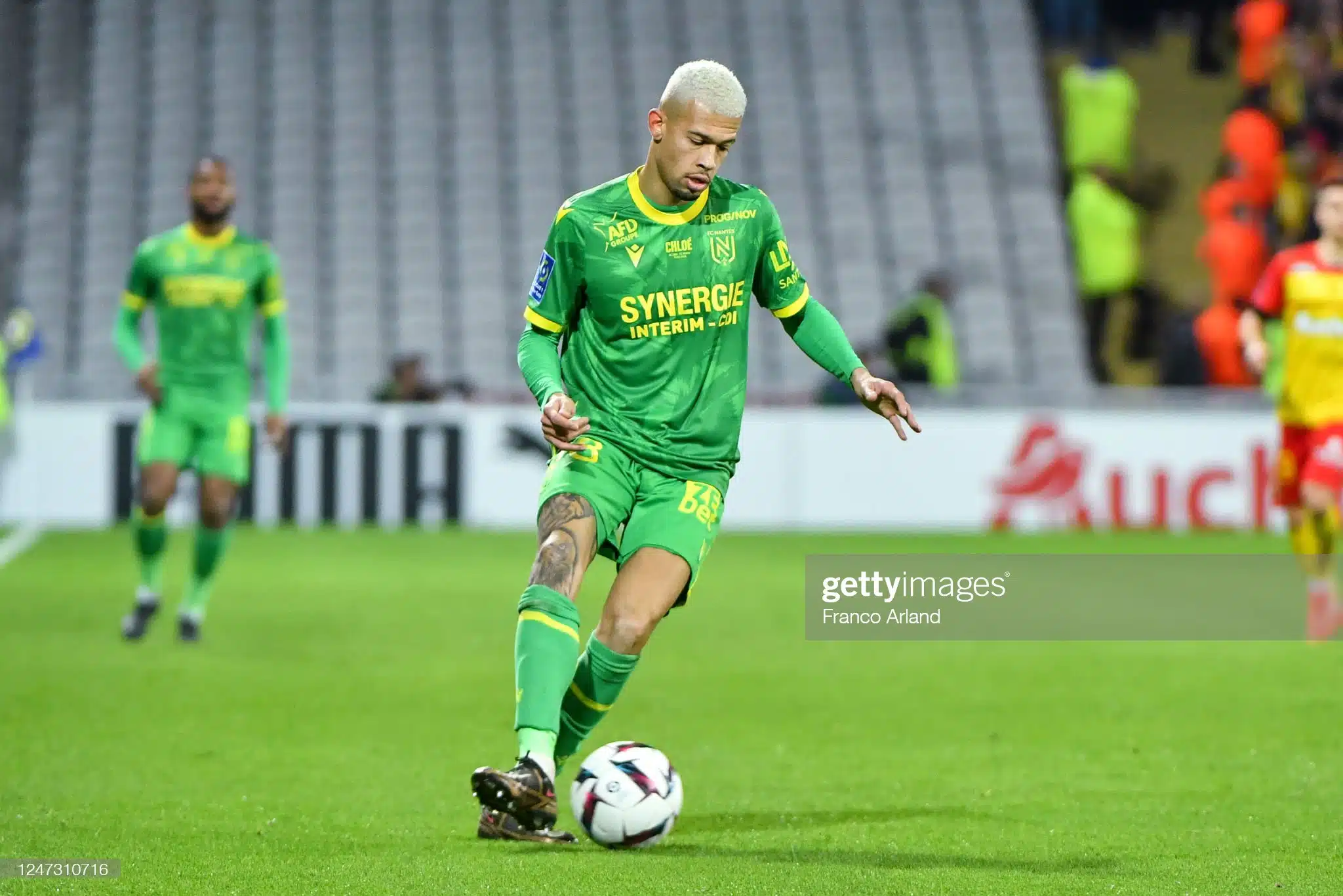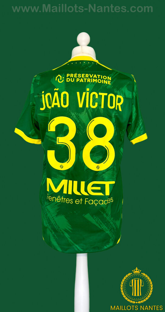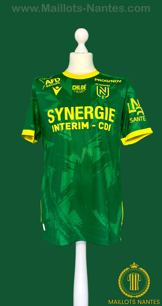 Maillot FC Nantes porté par João Victor lors du match de la 24ème journée de Ligue 1 le 19 Février 2023 à Lens. Maillot arborant le prénom Chloé en hommage à Chloé Ganago, fille d’Ignatius Ganago décédée tragiquement à l’âge de 5 ans emportée par une maladie.