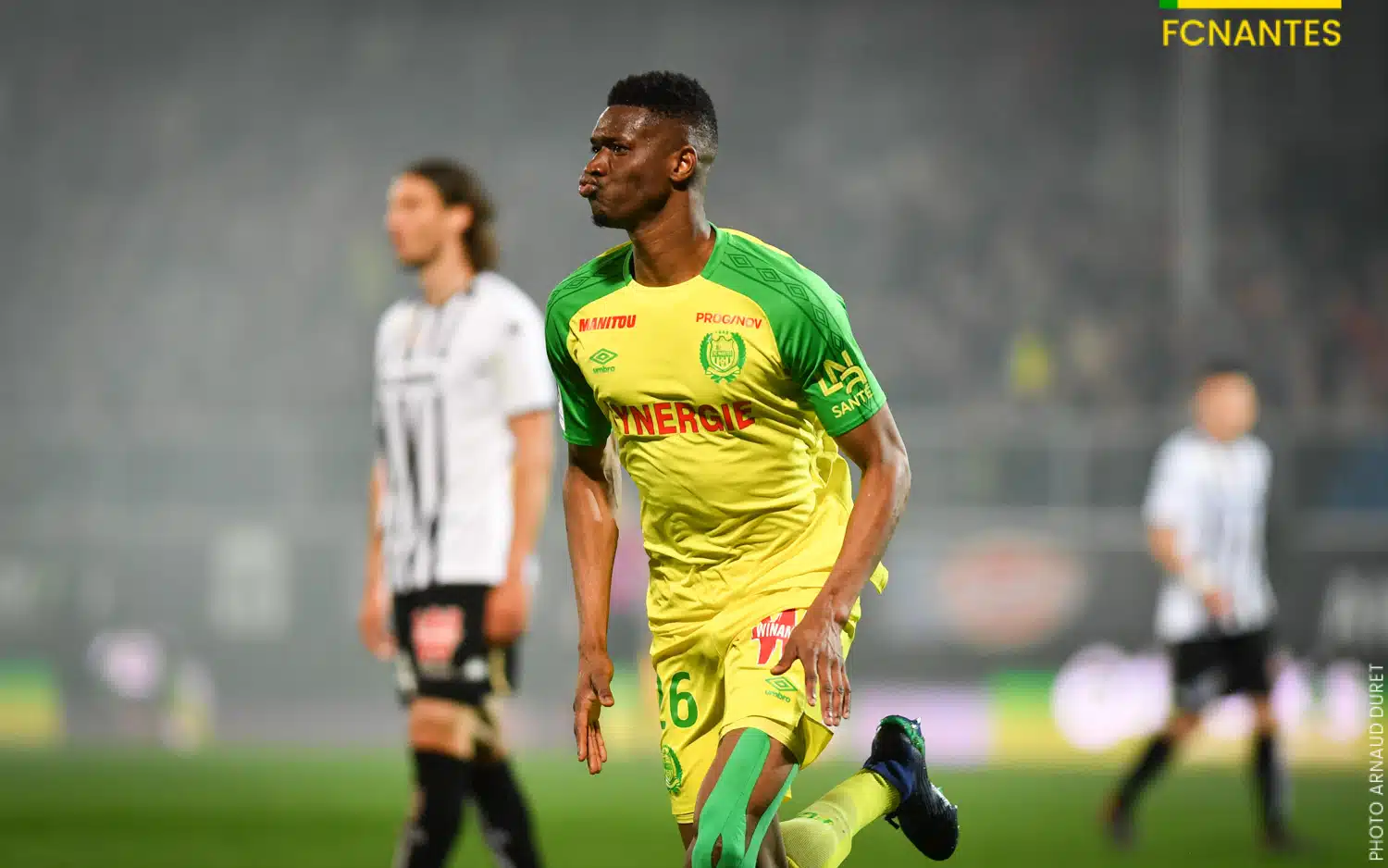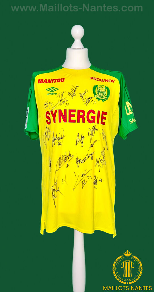 Maillot FC Nantes porté par Kalifa Coulibaly lors du match de la 37ème journée de Ligue 1 le 12 Mai 2018 à Angers. Kalifa Coulibaly inscrit son premier but en Ligue 1 lors de ce match et le maillot a été signé par l’ensemble des joueurs dont Emiliano Sala.