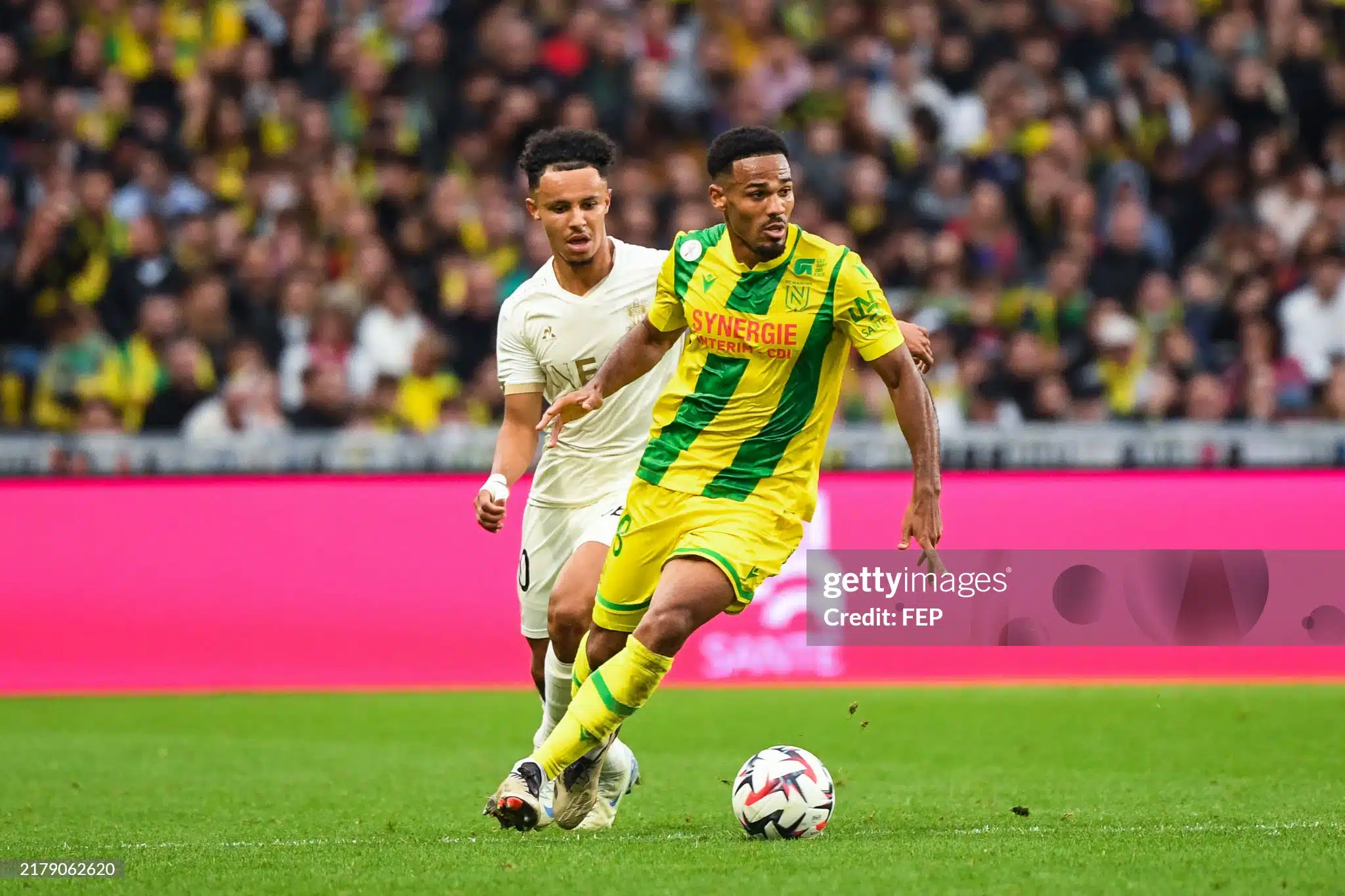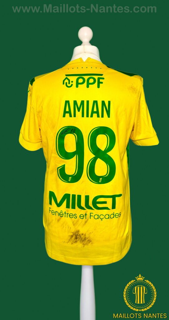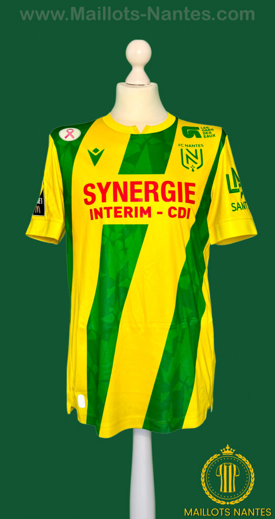 Maillot FC Nantes porté par Kelvin Amian lors du match comptant pour la 8ème journée de Ligue 1 le 20 Octobre 2024 contre l’OGC Nice. Pour ce match, les joueurs ont arboré sur leurs maillots un ruban rose symbole du combat des femmes contre le cancer du sein.