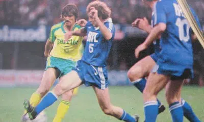 Maillot FC Nantes porté par le Numéro 8 lors de la saison 1978/1979. La seule photo que j’ai pu trouver de ce modèle est lors d’un match de Coupe de France donc avec des sponsors différents. Si vous avez des photos de ce modèle Europe 1 utilisé en match, merci de me contacter !