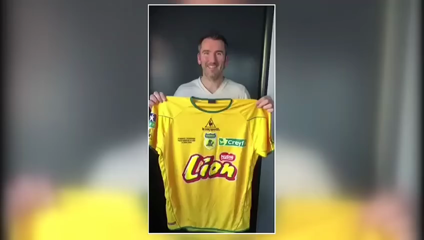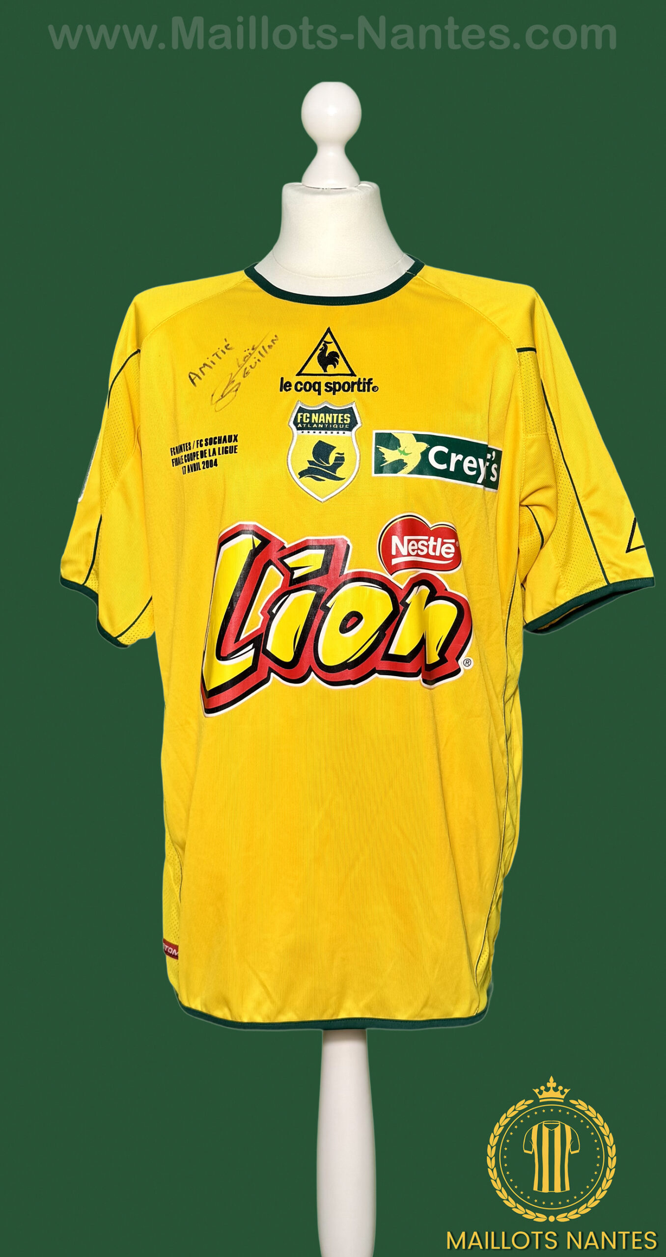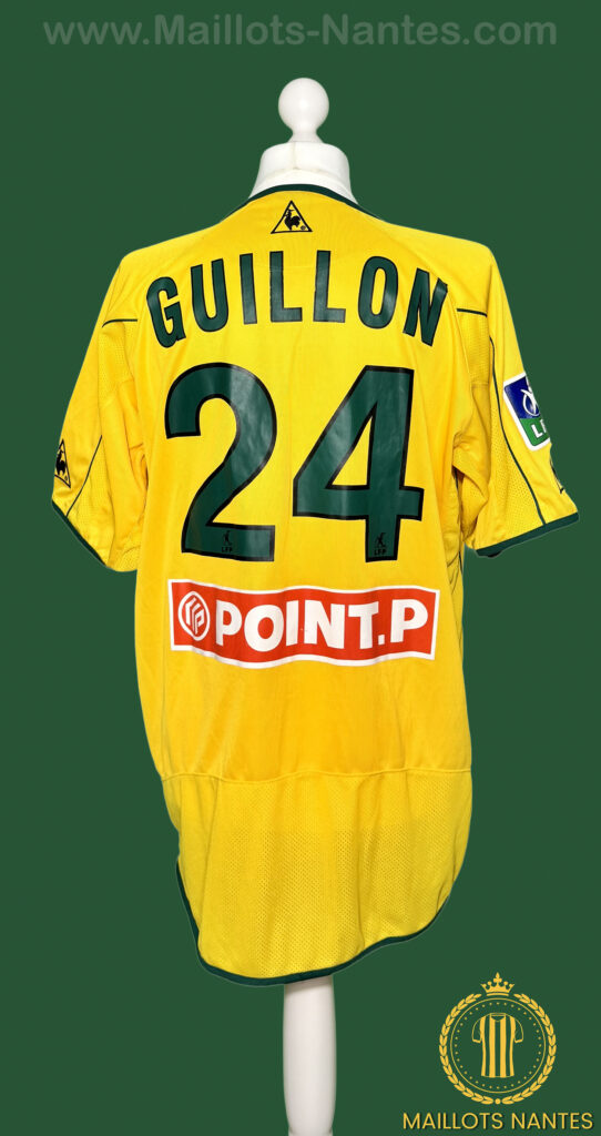 Maillot porté par Loïc Guillon lors de la finale de la Coupe de la Ligue contre Sochaux le 17 avril 2004. Loïc Guillon entre en jeu à la 73ᵉ minute de cette seule finale de Coupe de la Ligue disputée par le FC Nantes.