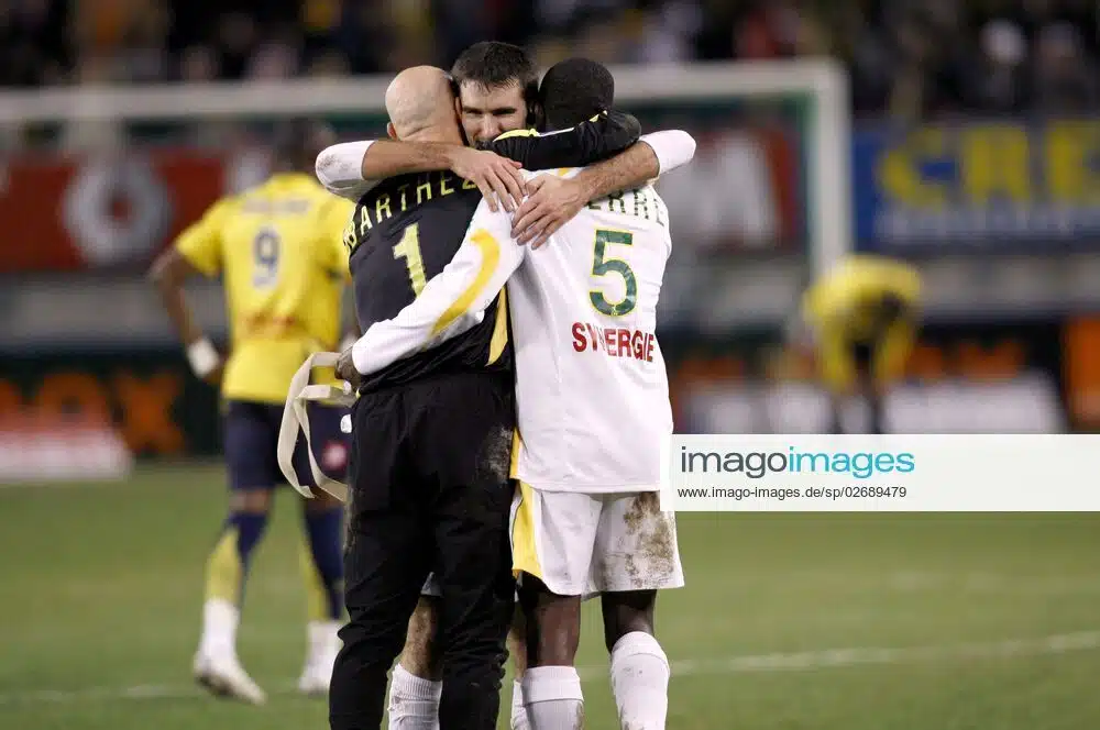 Maillot FC Nantes porté par Loïc Guillon lors du match de la 27ème journée de Ligue 1 le 4 Mars 2007 à Sochaux. Pas de sponsor à l’avant car Gamebookers qui était prévu pour être le sponsor maillot des matchs à l’extérieur a été interdit après 5 journées de championnat.