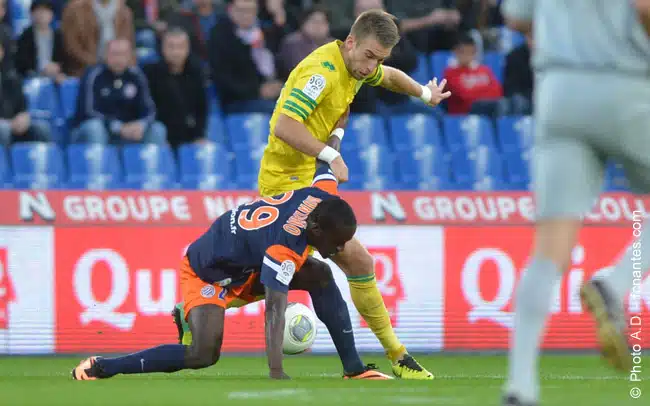 Maillot FC Nantes porté par Lucas Deaux lors du match comptant pour la 12ème journée de Ligue 1 le 3 Novembre 2013 à Montpellier. Maillot très particulier car lors de ce match, de nombreux joueurs nantais se sont retrouvés avec un maillot sans aucun sponsor à l’avant (pas de Synergie, Système U, Treignac) suite à une erreur.