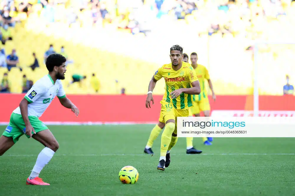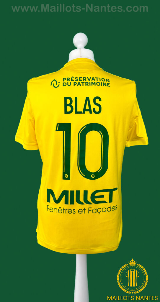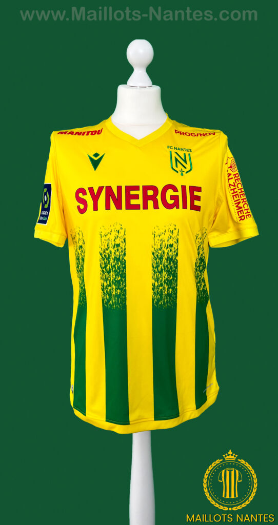 Maillot FC Nantes porté par Ludovic Blas lors du match comptant pour la 4ème journée de Ligue 1 le 20 Septembre 2020 contre l’AS Saint Etienne. Pour ce match, le sponsor LNA Santé, habituellement présent sur la manche gauche du maillot des joueurs nantais cède sa place au logo de la Fondation pour la Recherche sur Alzheimer.