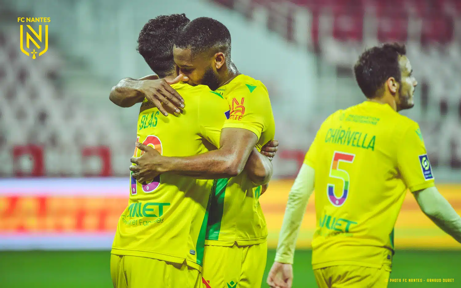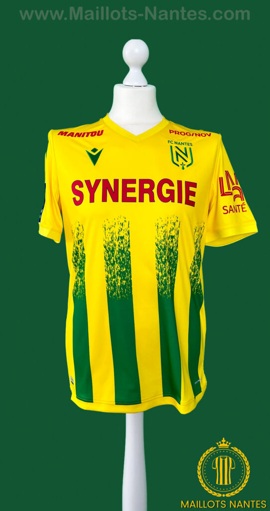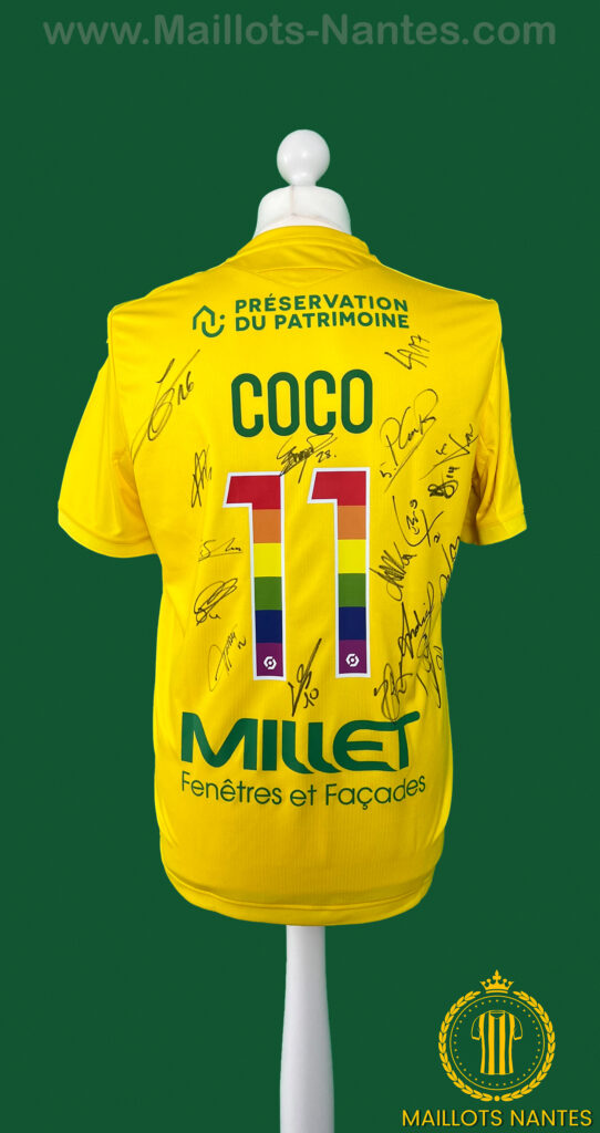 Maillot FC Nantes porté par Marcus Coco lors du match comptant pour la 37ème journée de Ligue 1 le 16 Mai 2021 à Dijon. Pour la toute première fois en France, les clubs ont été invités à floquer les maillots de leurs joueurs de numéros colorés en arc-en-ciel, reprenant le drapeau arc-en-ciel, symbole de paix, de diversité et surtout symbole par excellence du mouvement LGBT. Le maillot a également été signé par l’ensemble de l’effectif nantais.