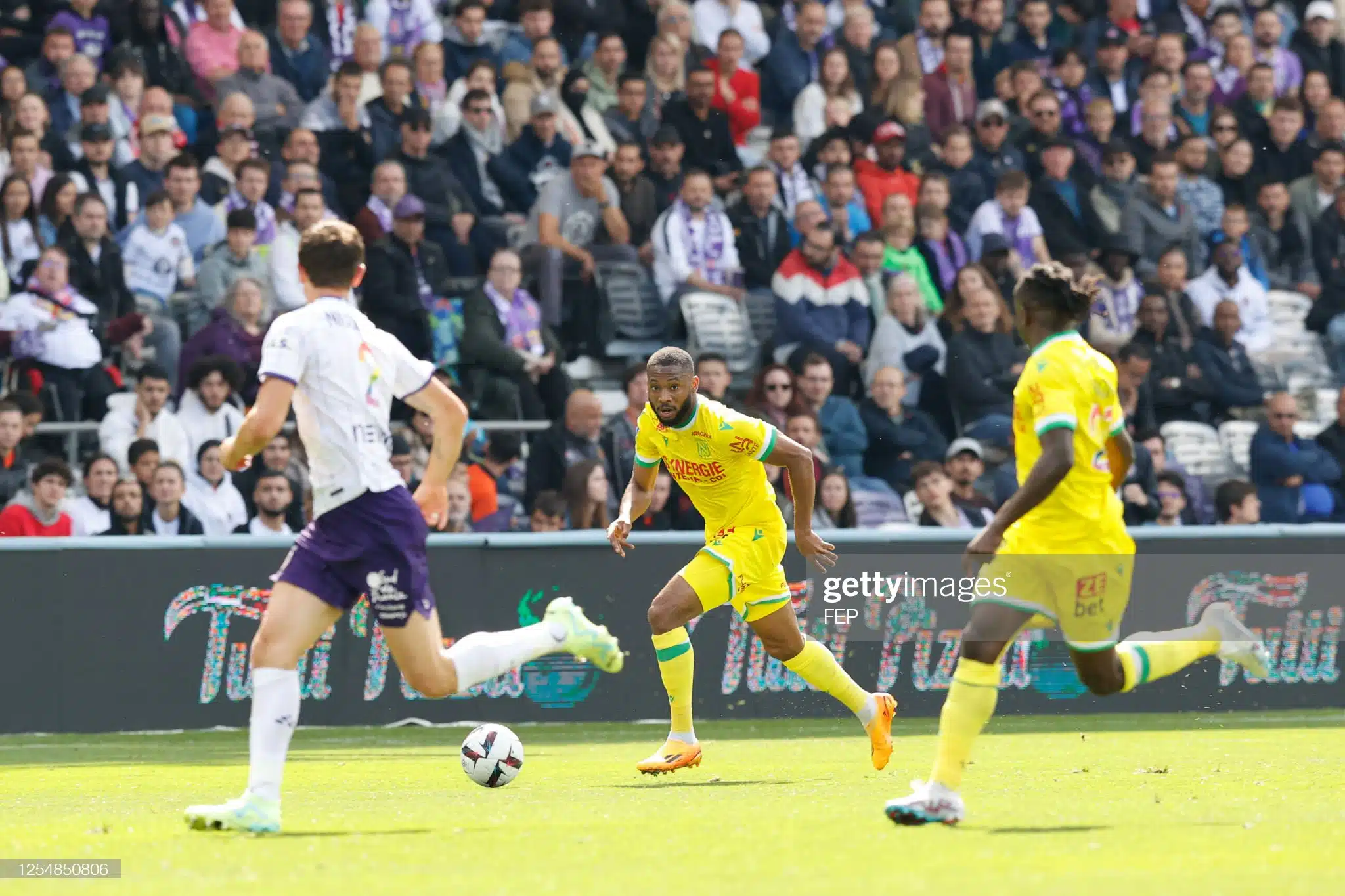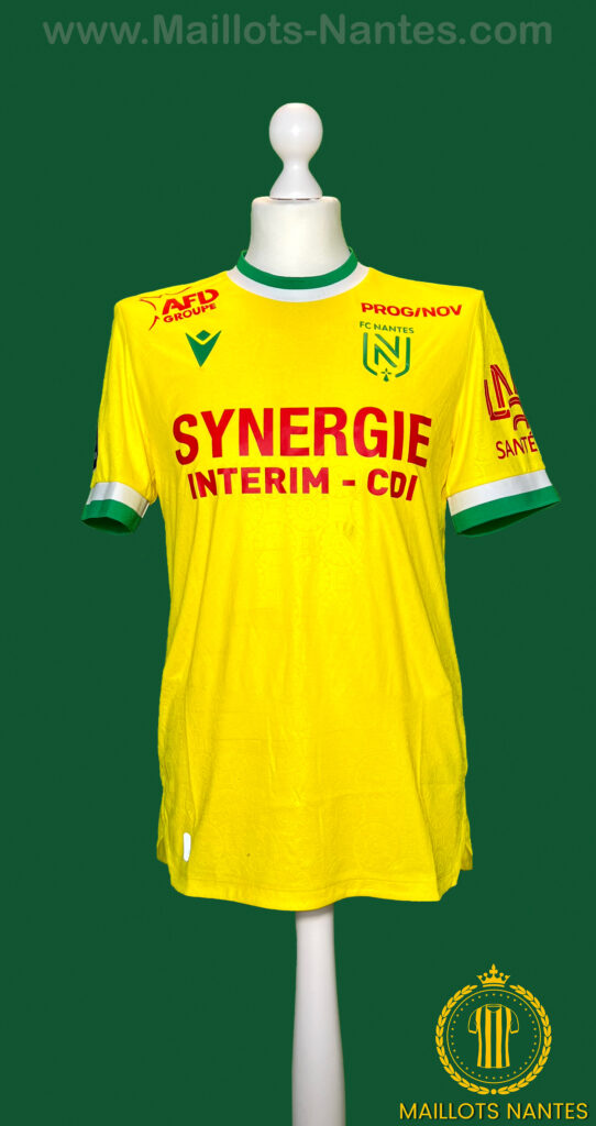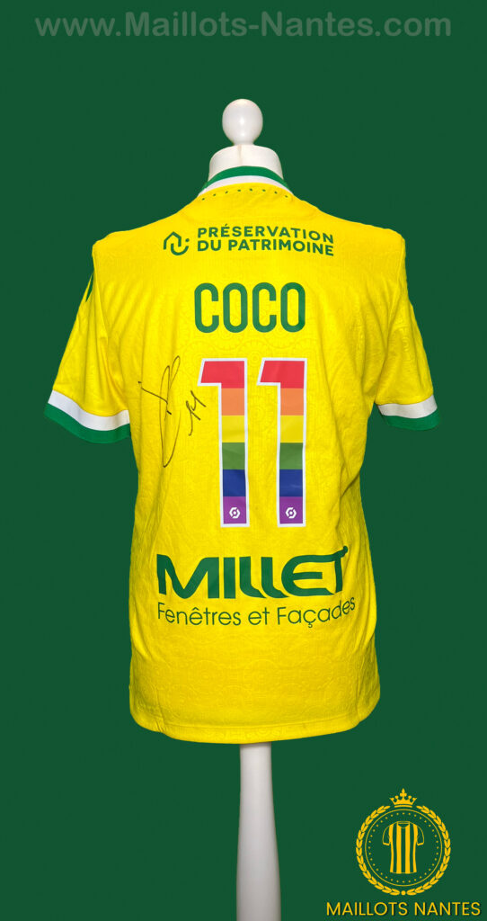 Maillot FC Nantes porté par Marcus Coco lors du match comptant pour la 35ème journée de Ligue 1 le 14 Mai 2023 à Toulouse. Pour la troisième saison consécutive, les clubs ont été invités à floquer les maillots de leurs joueurs de numéros colorés en arc-en-ciel, reprenant le drapeau arc-en-ciel, symbole de paix, de diversité et surtout symbole par excellence du mouvement LGBT.