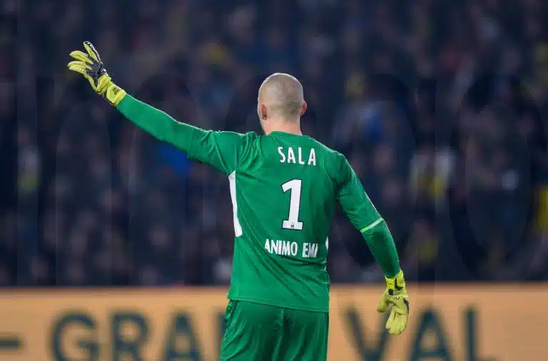 Maillot FC Nantes porté par Maxime Dupé lors du match comptant pour la 22ème journée de Ligue 1 le 30 Janvier 2019 contre l’AS Saint Etienne. Maillot en soutien à Emiliano Sala où les noms de tous les joueurs ont été remplacés par celui d’Emiliano et où le message Animo Emi est floqué en bas du maillot.