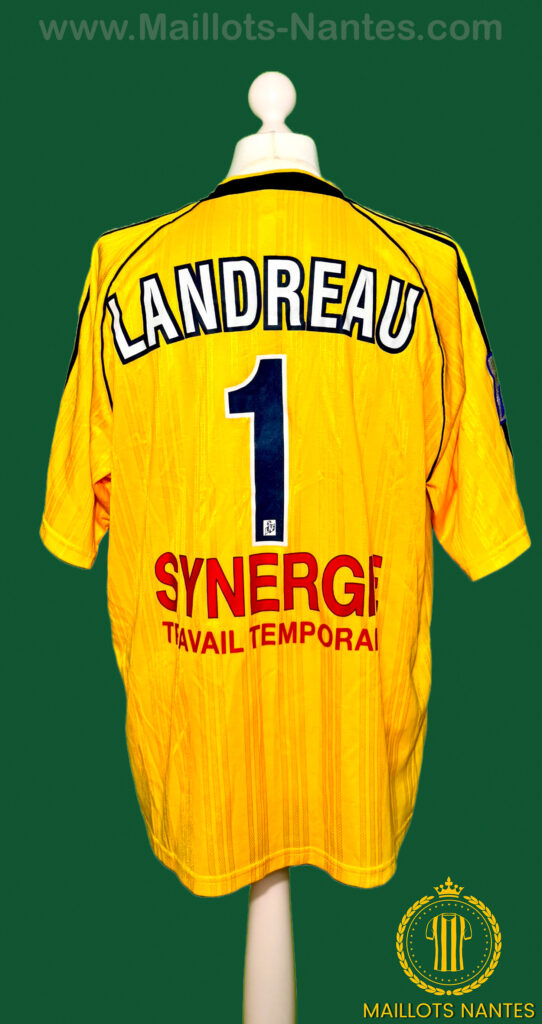 Maillot porté par Mickaël Landreau lors de la 2ᵉ journée de Division 1, le 6 août 1999 à Saint-Étienne. Ce modèle de gardien n’a été utilisé que lors de cette rencontre, ce qui en fait une pièce unique dans la saison 1999/2000 du FC Nantes.
