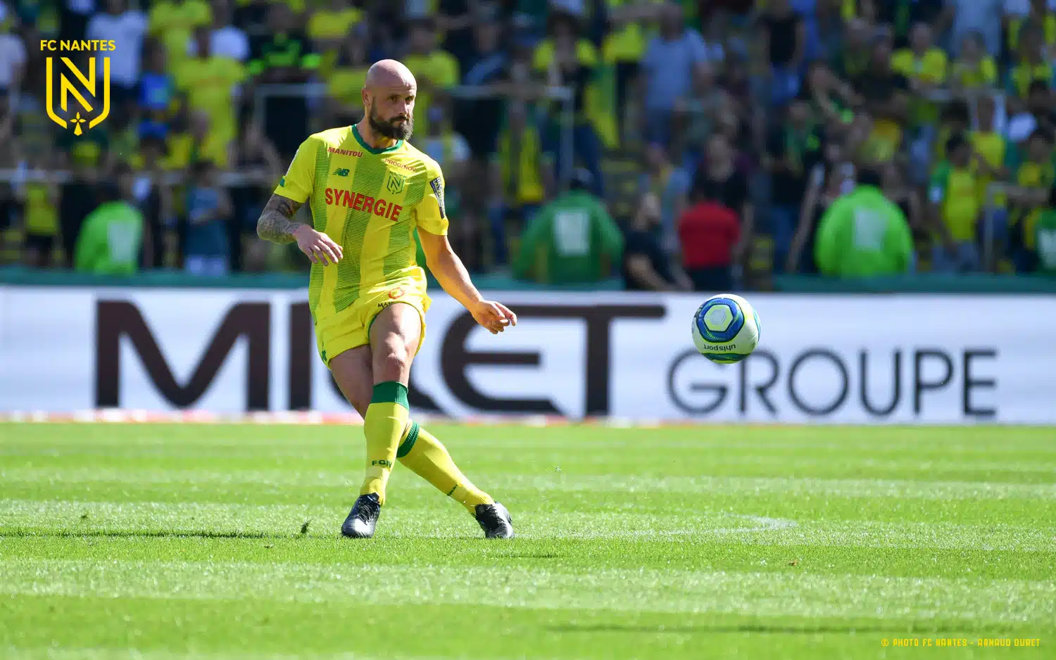 Maillot FC Nantes porté par Nicolas Pallois lors du match comptant pour la 5ème journée de Ligue 1 le 15 Septembre 2019 contre Reims. Pour ce match, le sponsor LNA Santé, habituellement présent sur la manche gauche du maillot des joueurs nantais cède sa place au logo de la Fondation pour la Recherche sur Alzheimer.