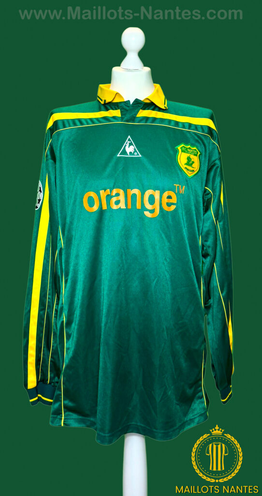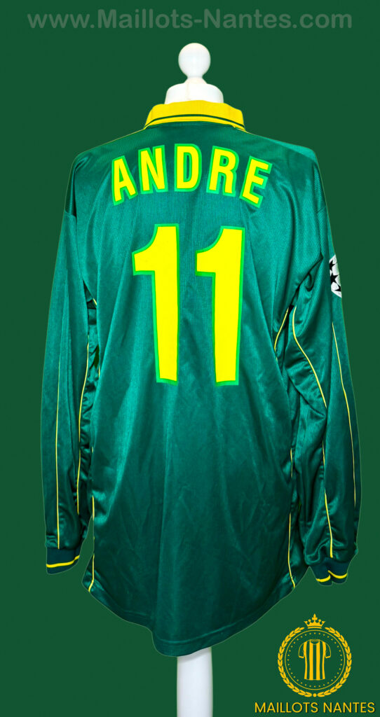 Ce maillot du FC Nantes a été porté par Pierre-Yves André lors de la mémorable campagne de Ligue des Champions2001/2002. Le joueur a privilégié les manches longues pour plusieurs rencontres : à Eindhoven contre le PSV, lors des deux affrontements face à Manchester United, ainsi qu’à la Beaujoire lors du match contre Boavista. Un maillot chargé d’histoire, symbole d’une compétition prestigieuse pour les Canaris.