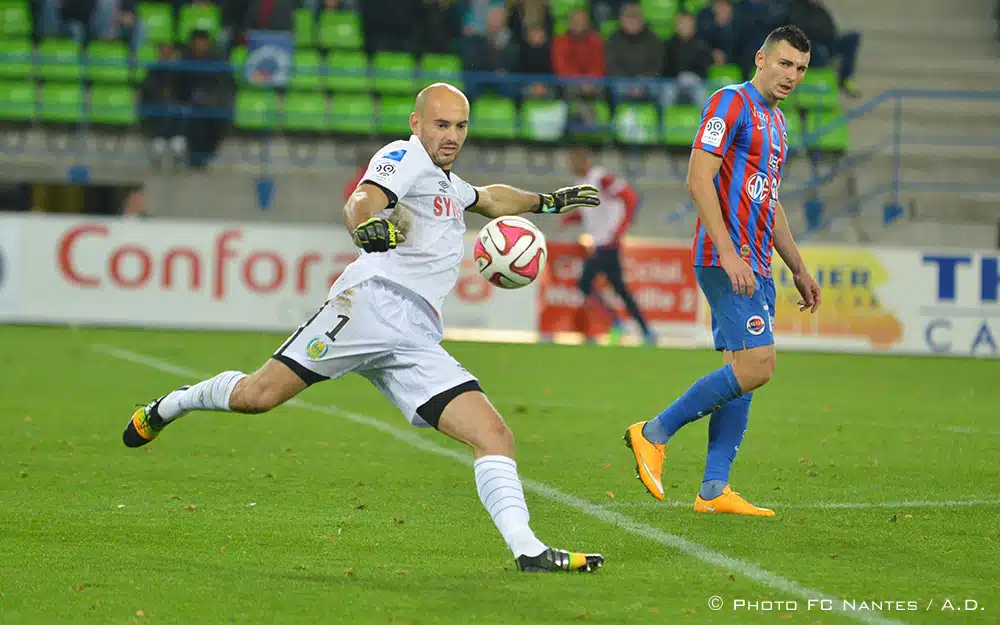 Maillot FC Nantes porté par Rémy Riou lors du match comptant pour la 13ème journée de Ligue 1 le 8 Novembre 2014 à Caen. Il s’agit de la première apparition du Bleuet de France (symbole de la mémoire et de la solidarité, en France, envers les anciens combattants, les victimes de guerre, les veuves et les orphelins) sur les maillots du FC Nantes.