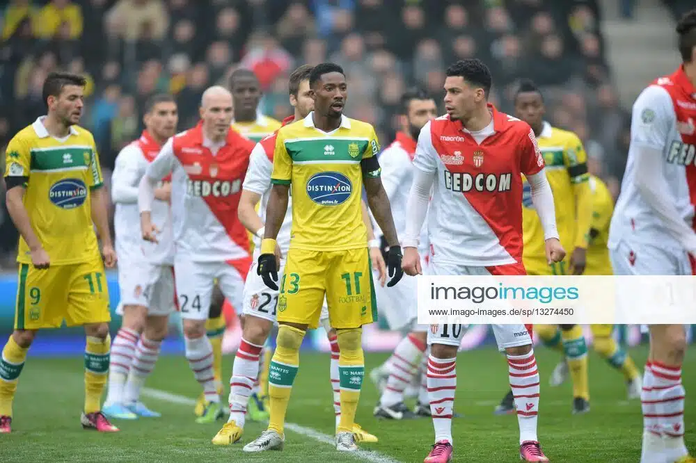 Maillot FC Nantes porté par Serge Gakpé lors du match comptant pour la 30ème journée de Ligue 2 le 30 Mars 2013 face à Monaco. Sponsor Distinxion utilisé à trois reprises cette saison là, contre Auxerre à l’aller et au retour et contre Monaco à domicile.