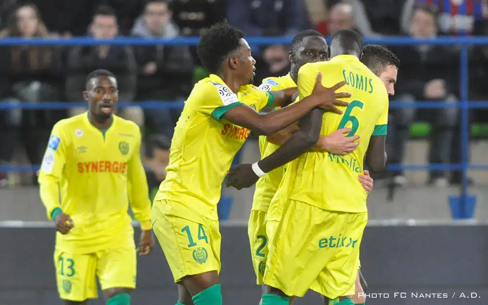 Maillot FC Nantes porté par Serge Gakpé lors du match comptant pour la 13ème journée de Ligue 1 le 8 Novembre 2014 à Caen. Il s’agit de la première apparition du Bleuet de France (symbole de la mémoire et de la solidarité, en France, envers les anciens combattants, les victimes de guerre, les veuves et les orphelins) sur les maillots du FC Nantes.