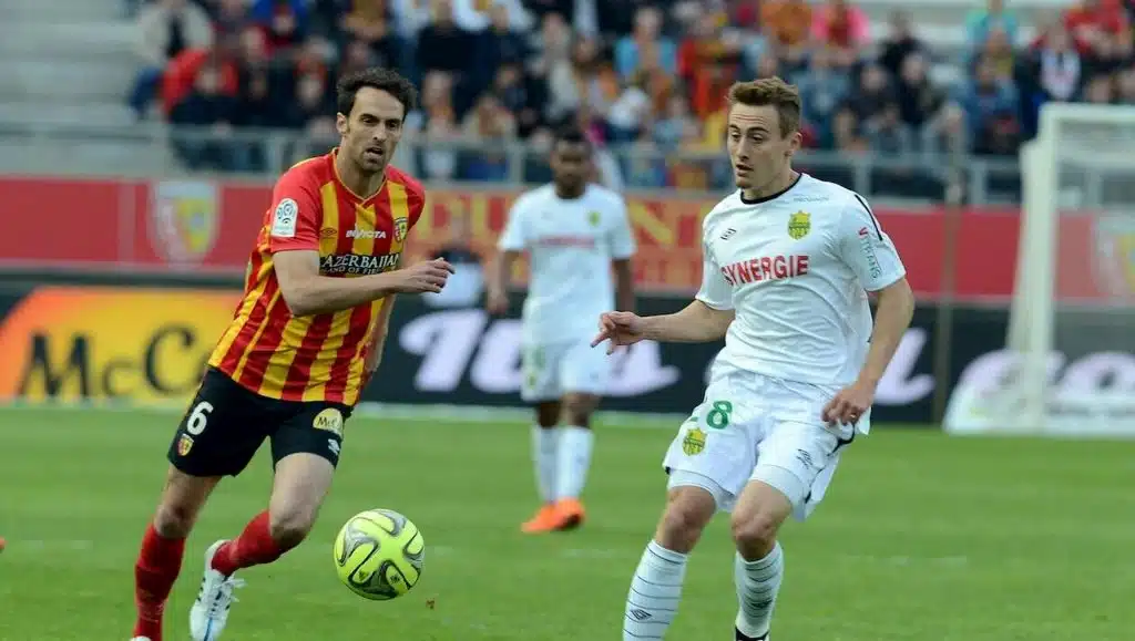Maillot FC Nantes porté par Valentin Rongier lors du match comptant pour la 38ème journée de Ligue 1 le 23 Mai 2015 à Lens. Il s’agit d’un maillot unique car le RC Lens jouant jaune et rouge, le FC Nantes a été obligé d’utiliser un simple maillot Umbro blanc pour cette journée de Ligue 1.