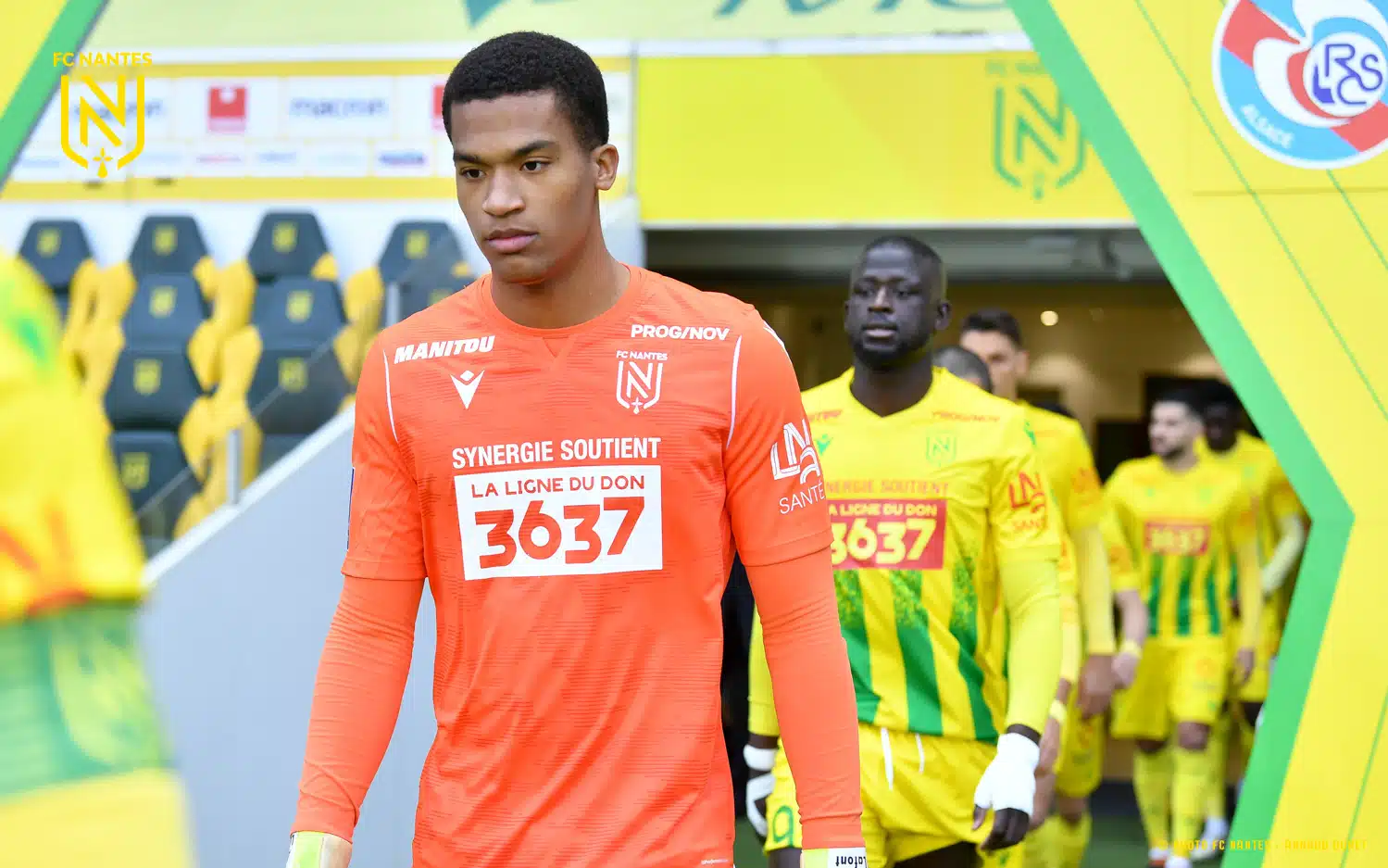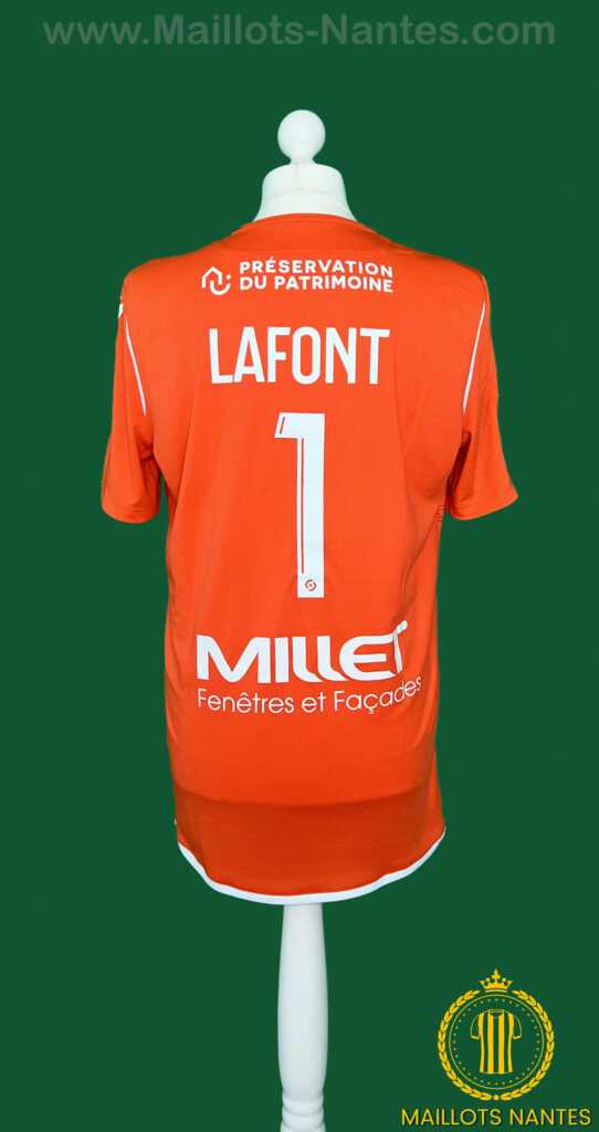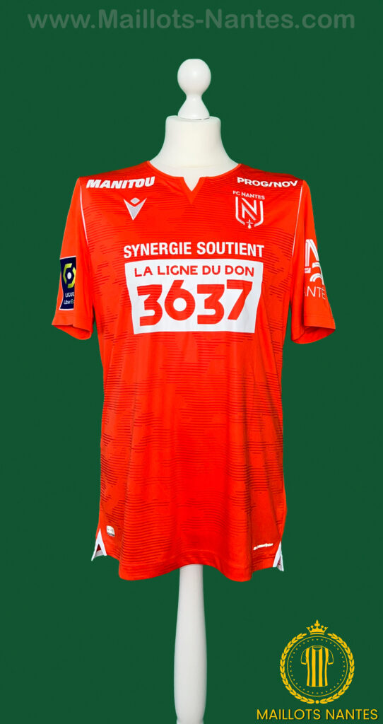 Maillot FC Nantes préparé pour Alban Lafont pour le match de la 13ème journée de Ligue 1 le 6 Décembre 2020 face au RC Strasbourg. Pour ce match, le sponsor habituel Synergie a accepté de laisser sa place au profit du 3637 le numéro de téléphone permettant de réaliser des dons en faveur du Téléthon.