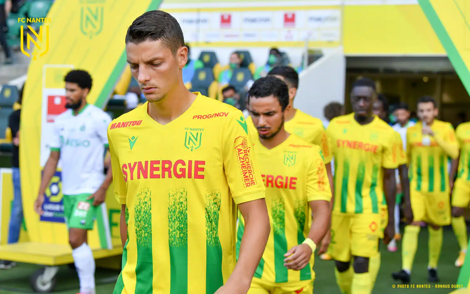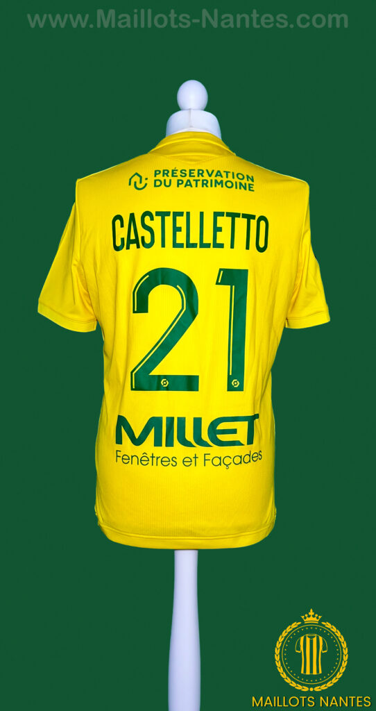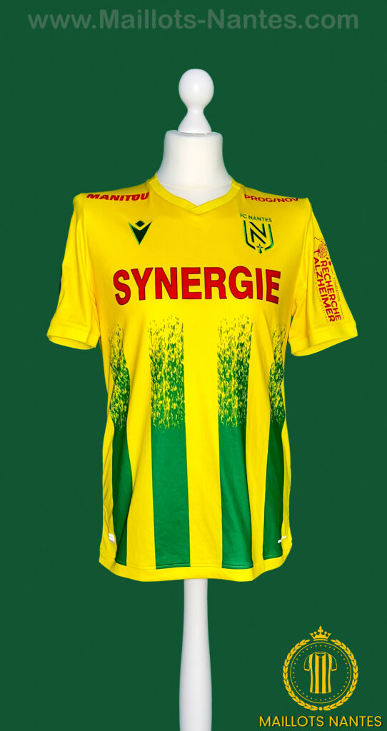 Maillot FC Nantes préparé pour Jean-Charles Castelletto pour le match de la 4ème journée de Ligue 1 le 20 Septembre 2020 contre l’AS Saint Etienne. Pour ce match, le sponsor LNA Santé, habituellement présent sur la manche gauche du maillot des joueurs nantais cède sa place au logo de la Fondation pour la Recherche sur Alzheimer.