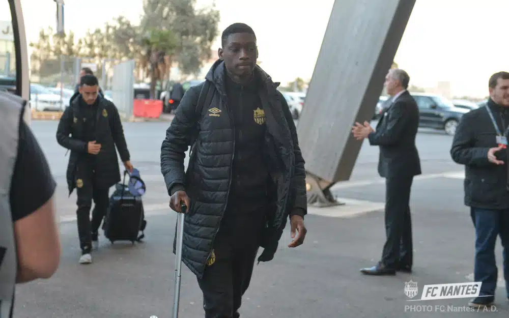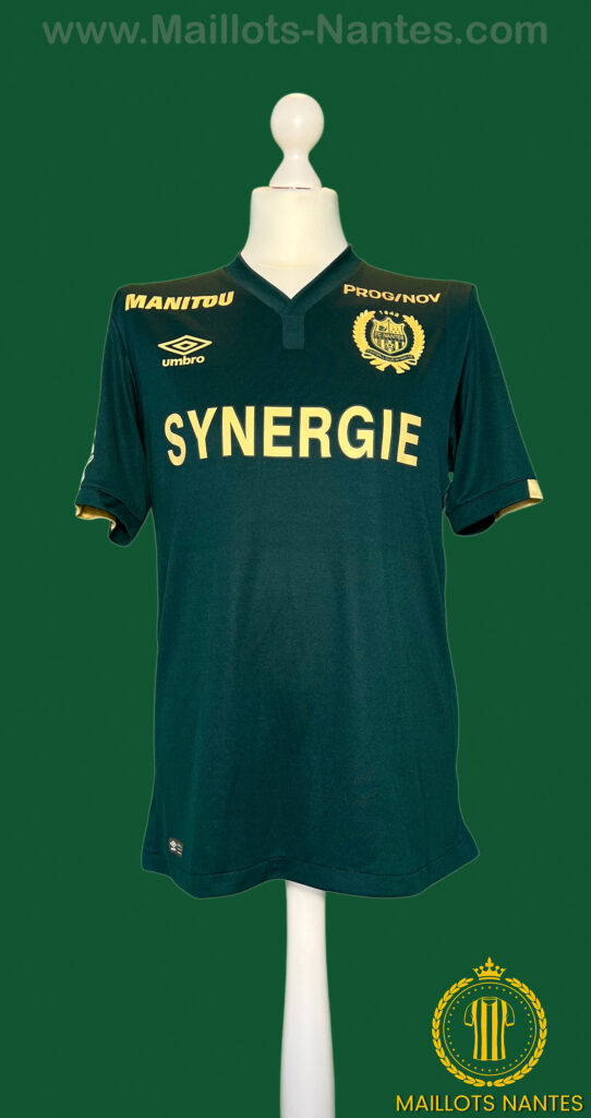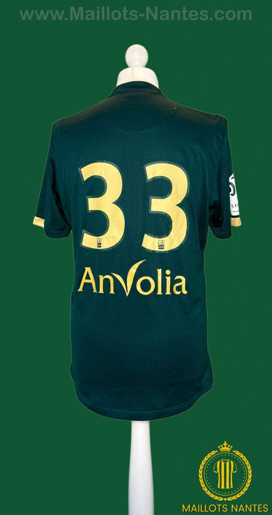 Maillot FC Nantes préparé pour Randal Kolo Muani pour un match de Ligue 1 à l’extérieur lors de la saison 2016/2017. Lors de cette saison Randal Kolo Muani fait ses premières apparitions sur le banc du groupe professionnel et signera son premier contrat pro à l’issue de la saison.