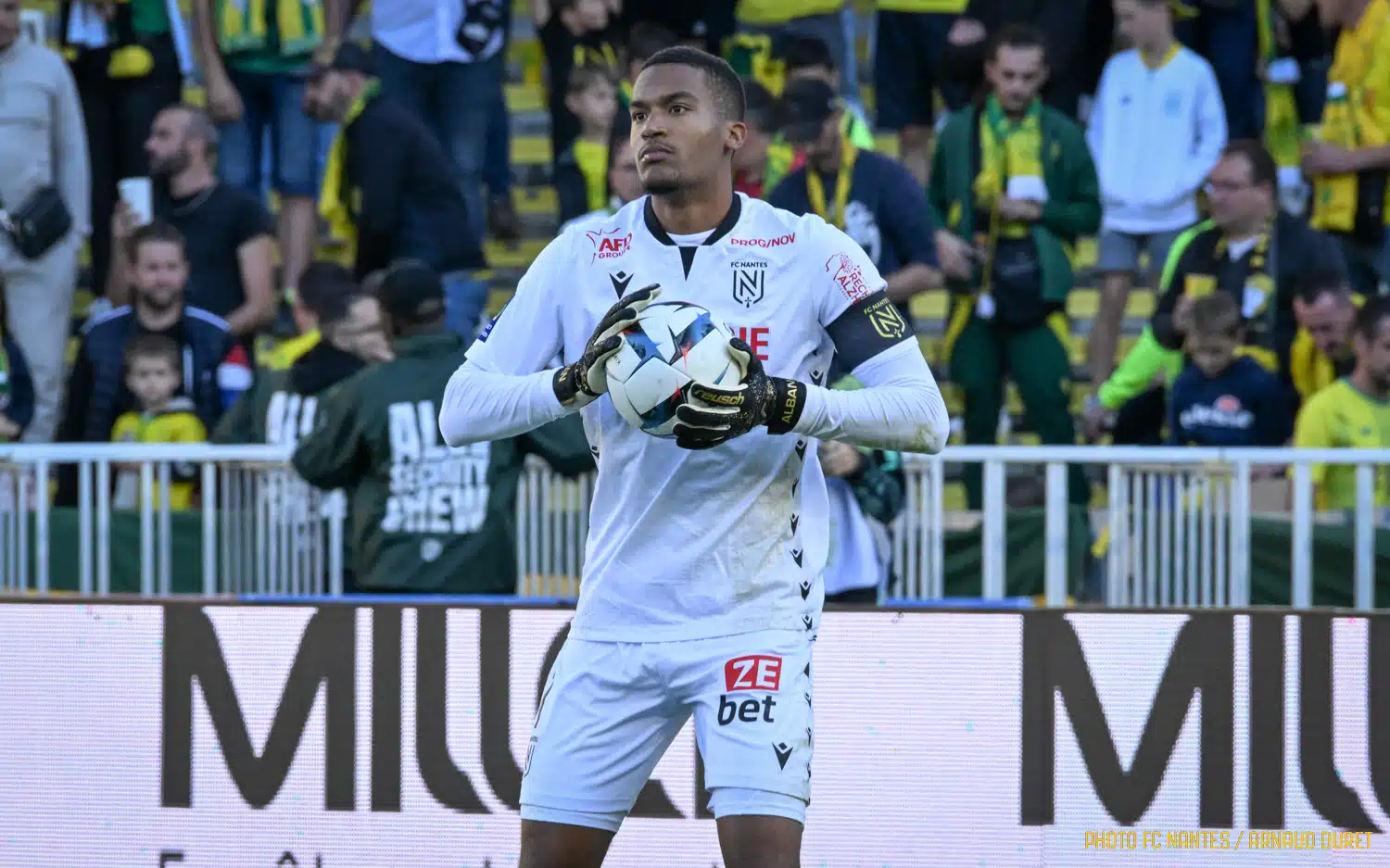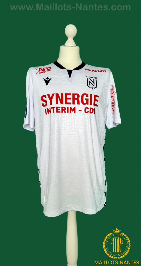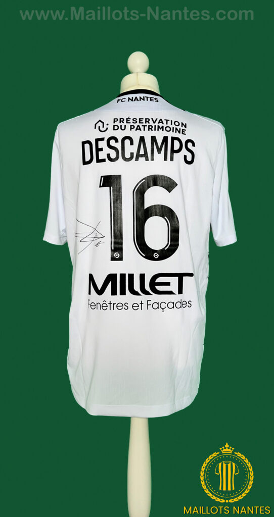 Maillot FC Nantes préparé pour Rémy Descamps pour le match de la 8ème journée de Ligue 1 le 18 Septembre 2022 contre le RC Lens. Pour ce match, le sponsor LNA Santé, habituellement présent sur la manche gauche du maillot des joueurs nantais cède sa place au logo de la Fondation pour la Recherche sur Alzheimer. Alban Lafont était titulaire et Rémy Descamps est resté sur le banc.