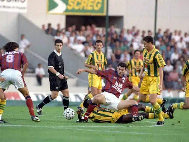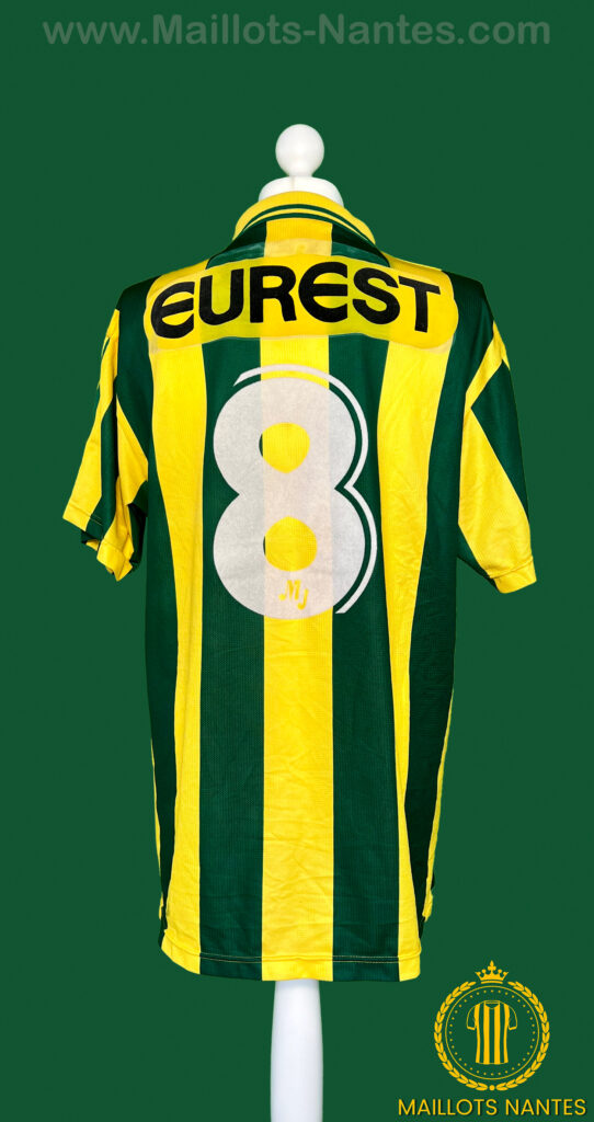 Maillot rare puisque par la suite le maillot utilisé avait le texte Adidas sur le côté et non centré laissant la place au blason nantais côté droit. De plus un encart jaune fit son apparition à l’avant et à l’arrière du maillot pour une meilleure visibilité des sponsors et flocages.