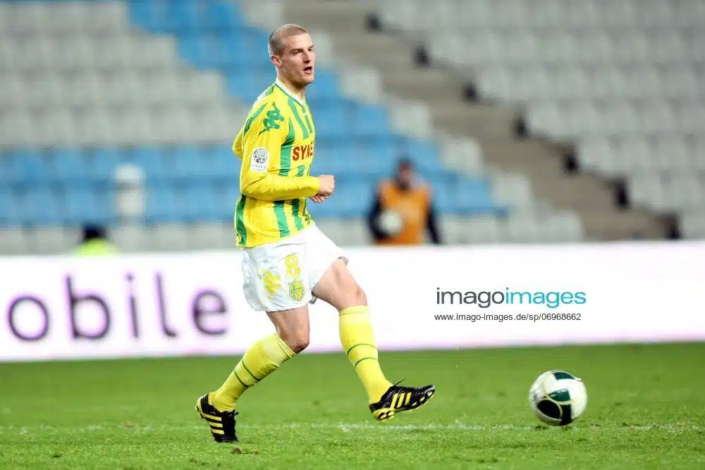Maillot FC Nantes préparé pour Stéphane Darbion lors de la saison 2010/2011. Ce modèle avec flocage rouge et sponsors Synergie à l’avant Croix Rouge Française à l’arrière n’a jamais été utilisé. Le club a commencé la saison avec des flocages blancs puis les flocages rouges sont arrivés en même temps que le sponsor Distinxion à l’avant puis Anvolia dans le dos.